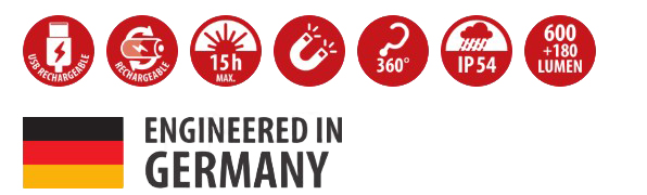 • Radna svjetiljka nudi domet snopa od cca. 30 m i opremljena je kukom podesivom za 360°, 2 magneta u podnožju koje se savija za 90° i gumiranom površinom za najbolji hvat.