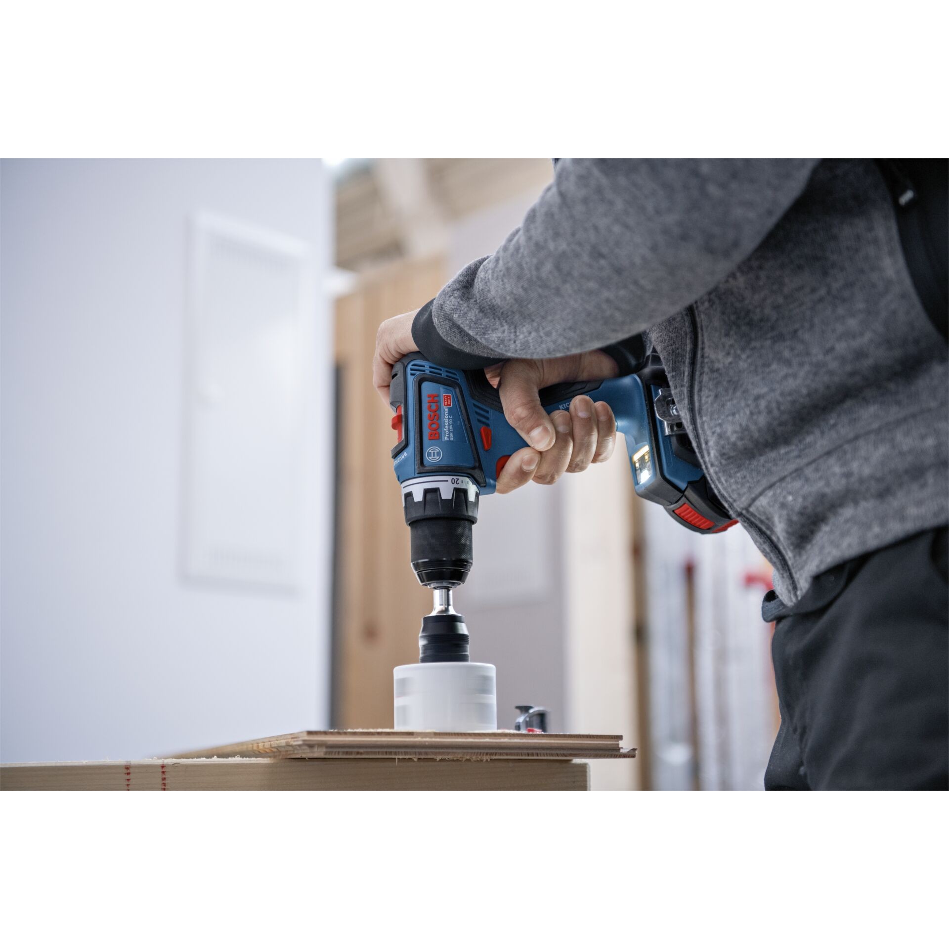 This tool is designed for drilling in wood with a maximum diameter of 68 mm and in steel with a diameter up to 13 mm. The GSR 18V-90 C Professional is compatible with all Bosch Professional 18V batteries and chargers (Professional 18V System). Also compatible with AMPShare, the cross-brand battery alliance.