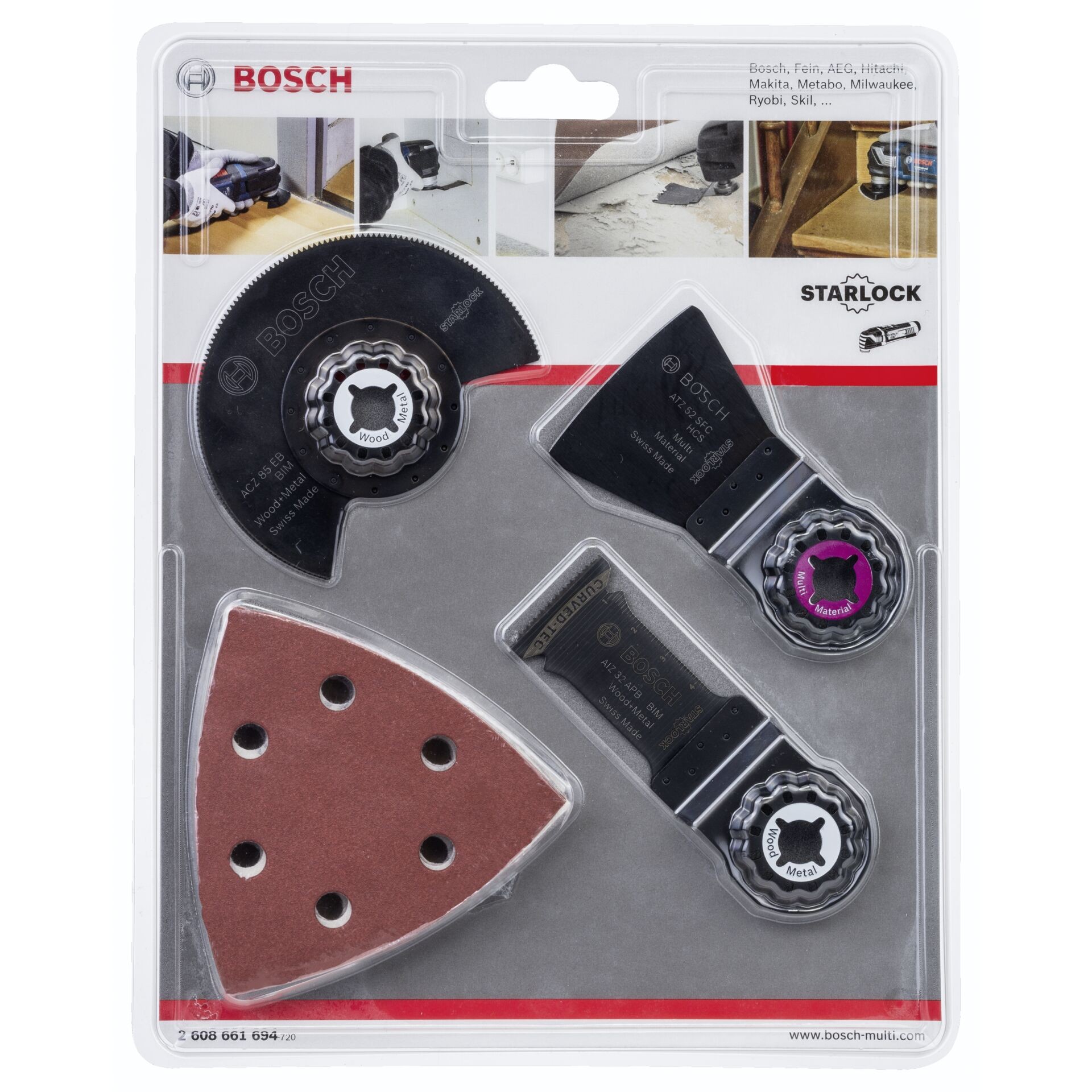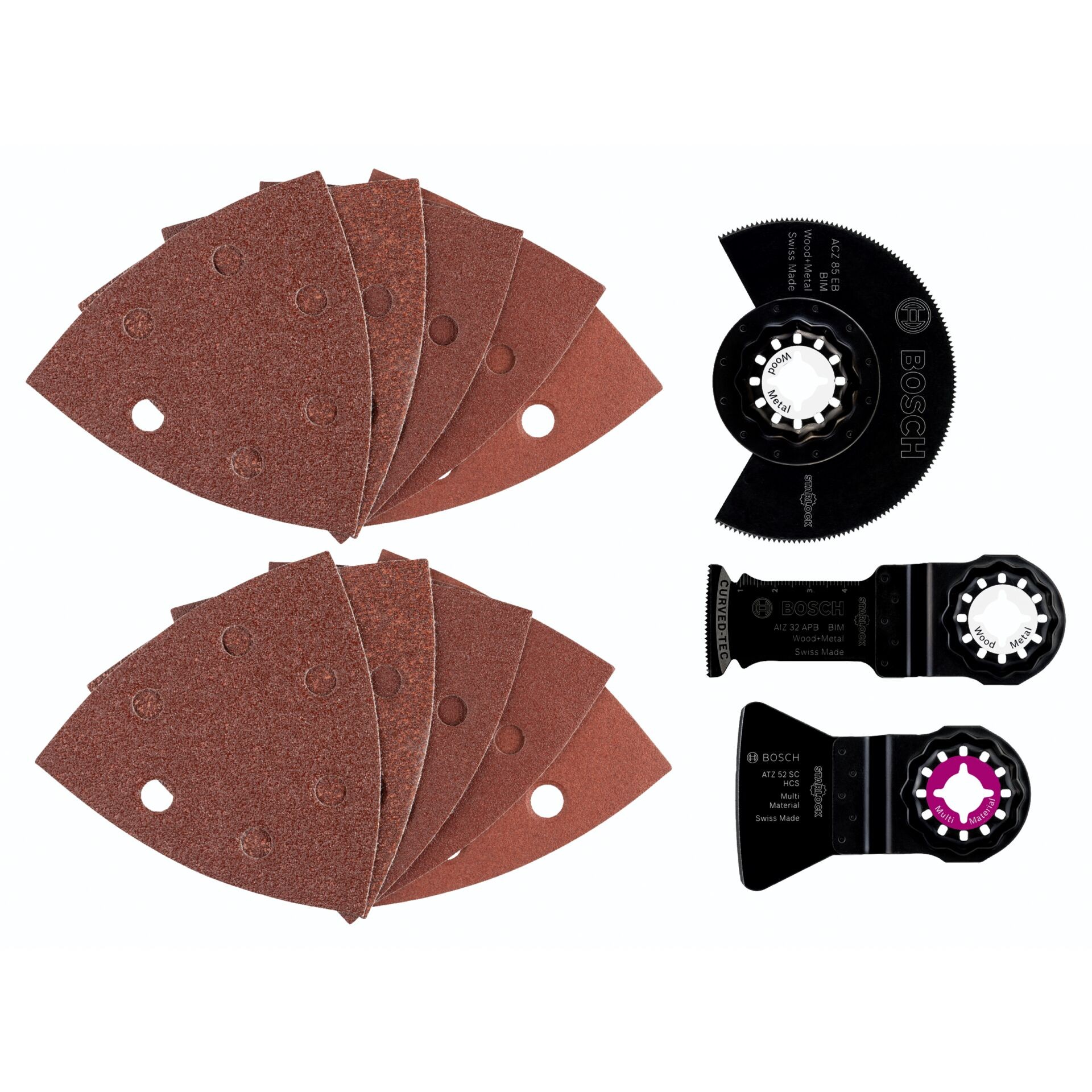 The universal set of 13 Starlock accessories is a versatile tool set Each Starlock accessory has been individually selected for different applications due to its special value and performance. Set of 13 Starlock accessories including blades for sawing, plunge cutting, grinding and scraping various materials. Included is a segment saw for flush cutting of door frames, cutting of smaller profiles, cutting of laminate and parquet, and a plunge saw blade for making recesses in wood. Also included is a set of sanding sheets for sanding wood and paint and a scraper for removing soft material. These Starlock accessories are compatible with all Starlock, Starlock Plus and Starlock Max power tools as well as all common multifunctional tools.