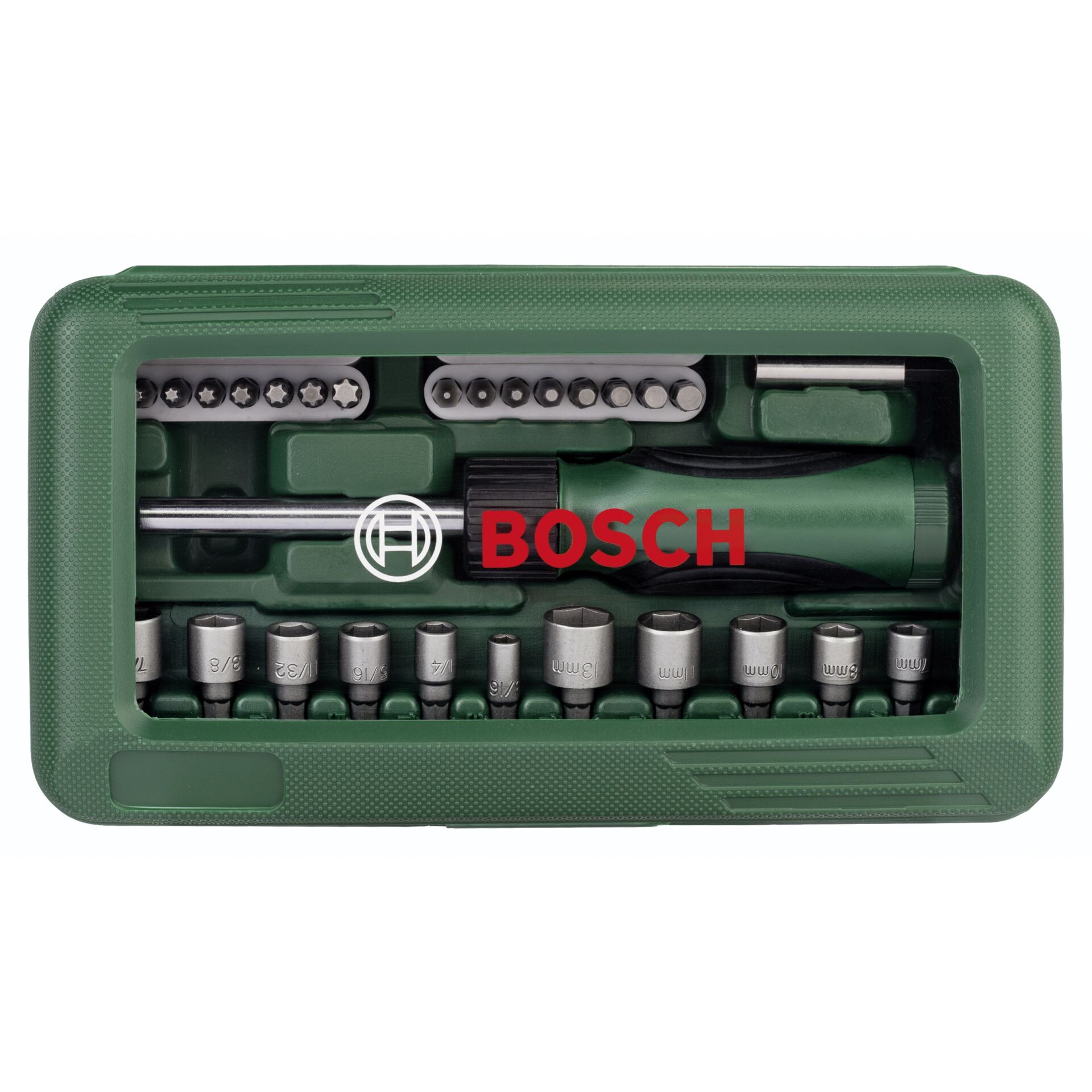 32 screwdriver bits L = 30 mm, PH 0/1/2/3, PZ 0/1/2/3, S 3/4/4.5/5/6/7/8/9, HEX 1.5/2/2.5/3/4/5/5.5/6, T 8/10/15/20/25/27/30/40, 12 socket wrenches for hexagon screws, 3/16", 1/4", 5/16", 11/32",3/8",7/16",, 6, 7, 8, 10, 11, 13 mm, 1 universal holder, magnetic, 1 hand screwdriver, ratchet function, clockwise/anticlockwise, bit garage in handle