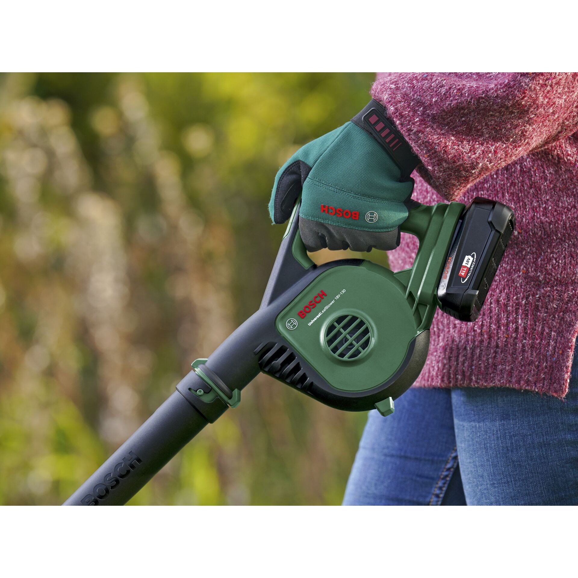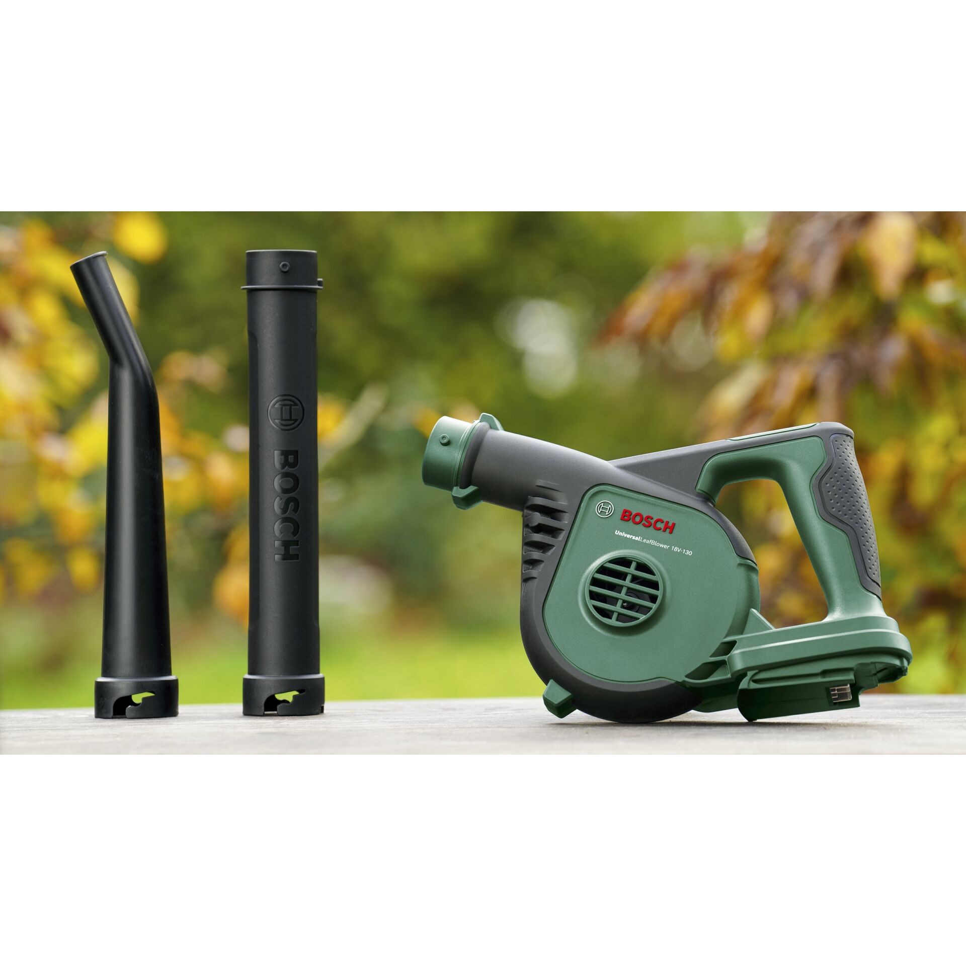 Easily remove garden waste with the UniversalLeafBlower 18V-130 wireless. The light and compact leaf blower has an ergonomic handle and can be easily carried to the far corners of the garden. It has a simple 2-speed switch for airflow control for more powerful or controlled cleaning. The Bosch 18V POWER FOR ALL battery and Syneon Technology provide an impressive air flow speed of 245 km/h for fast and powerful cleaning. Several nozzle attachments provide versatile flexibility when cleaning the garden. The leaf blower is easy to assemble and store compactly, and runs for up to 18 minutes on a single charge. The built-in Bosch Syneon Electronic protects the device and the battery and is part of the 18V POWER FOR ALL system. A single battery can be used for all 18V POWER FOR ALL tools.