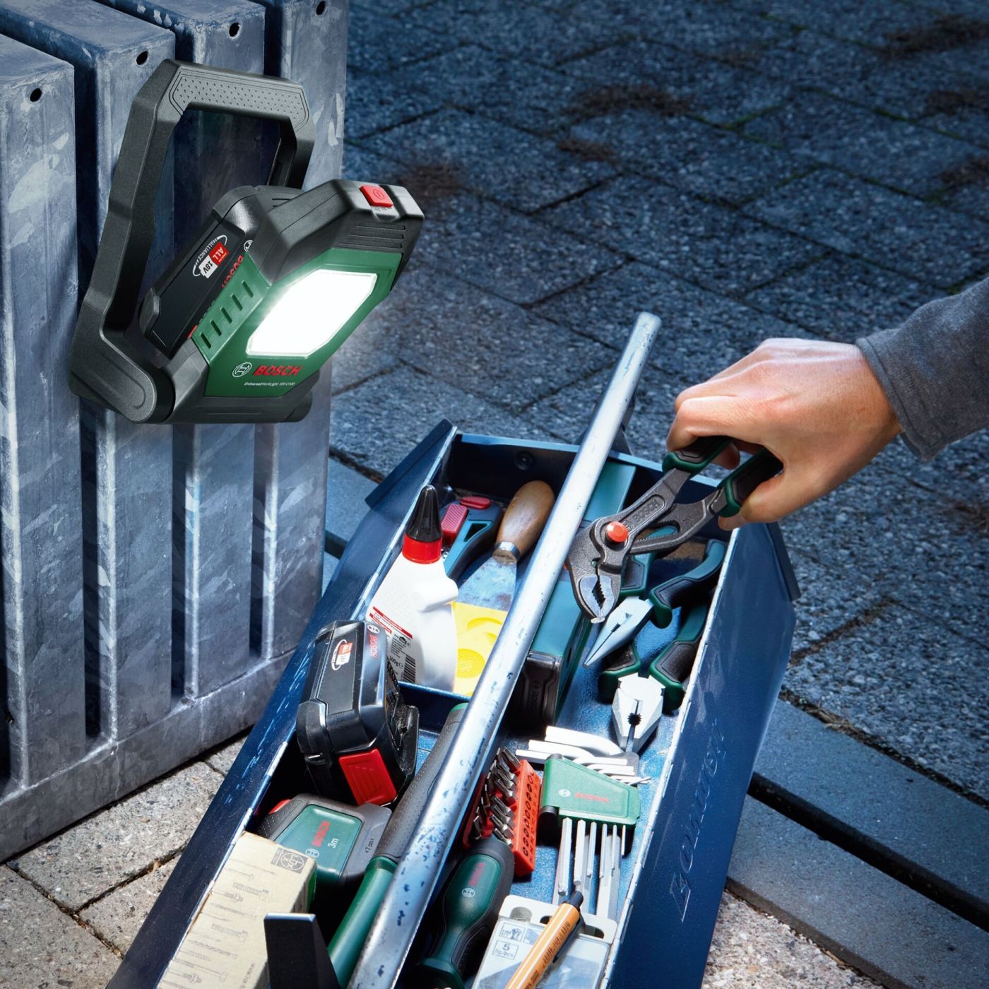 Rasvjeta u garažama, podrumima i mnogim drugim radnim mjestima s moćnom UniversalWorkLight 18V-2100. Ova snažna radna svjetiljka isporučuje 2100 lumena i nudi tri različite razine svjetline, što je čini idealnom za širok raspon primjena. Može se postaviti ili pričvrstiti na ljestve, vrata ili radijator pomoću integrirane kuke ili magneta. Fleksibilna glava svjetiljke može se lako podesiti za fleksibilno i ciljano osvjetljenje. Zahvaljujući nagibnoj glavi i kompaktnom dizajnu, ova radna svjetiljka se lako prenosi i skladišti. Ova svjetiljka je dio 18V POWER FOR ALL sustava, jedna baterija može se koristiti za sve 18V POWER FOR ALL alate.