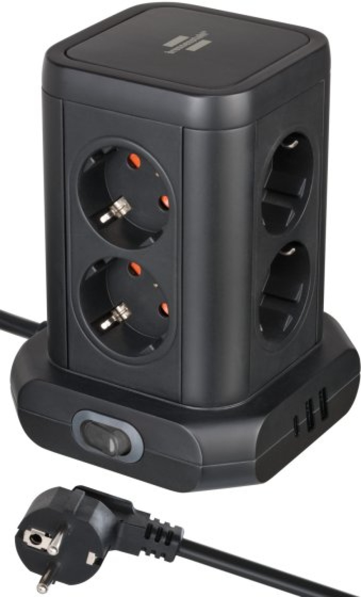 • Produžna utičnica s 8 utičnica u dizajnu tornja koji štedi prostor – inteligentno raspoređene uzemljene utičnice s poboljšanom zaštitom od kontakta, kabel od 2 m (H05VV-F 3G1.5) i dvopolni osvijetljeni prekidač za uključivanje/isključivanje.
