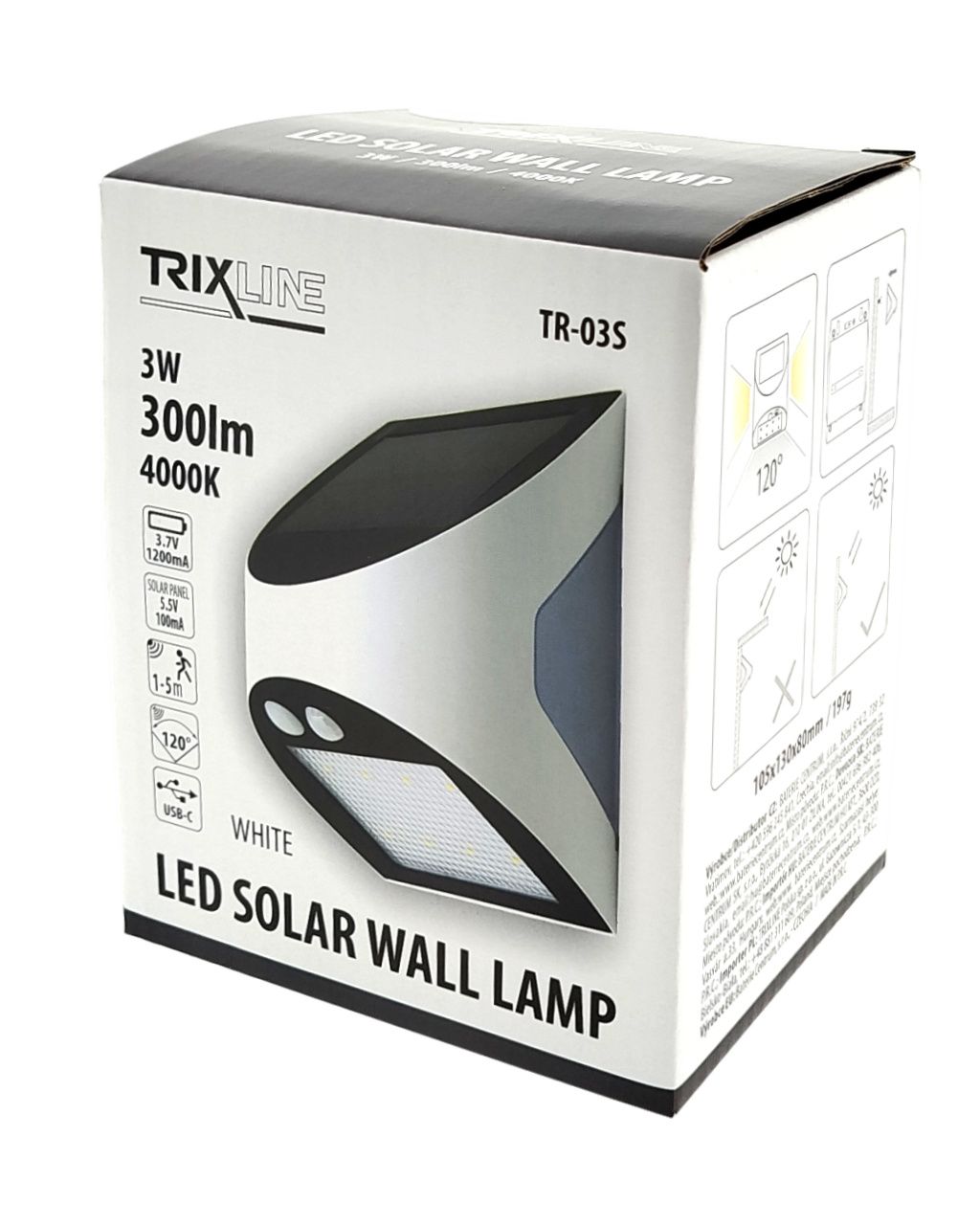 • LED solarna svjetiljka sa senzorom pokreta TR-03S  može se jednostavno postaviti na zid, na primjer, ima 8 LED svjetala sprijeda i 2 LED svjetla koja svijetle sa strane.