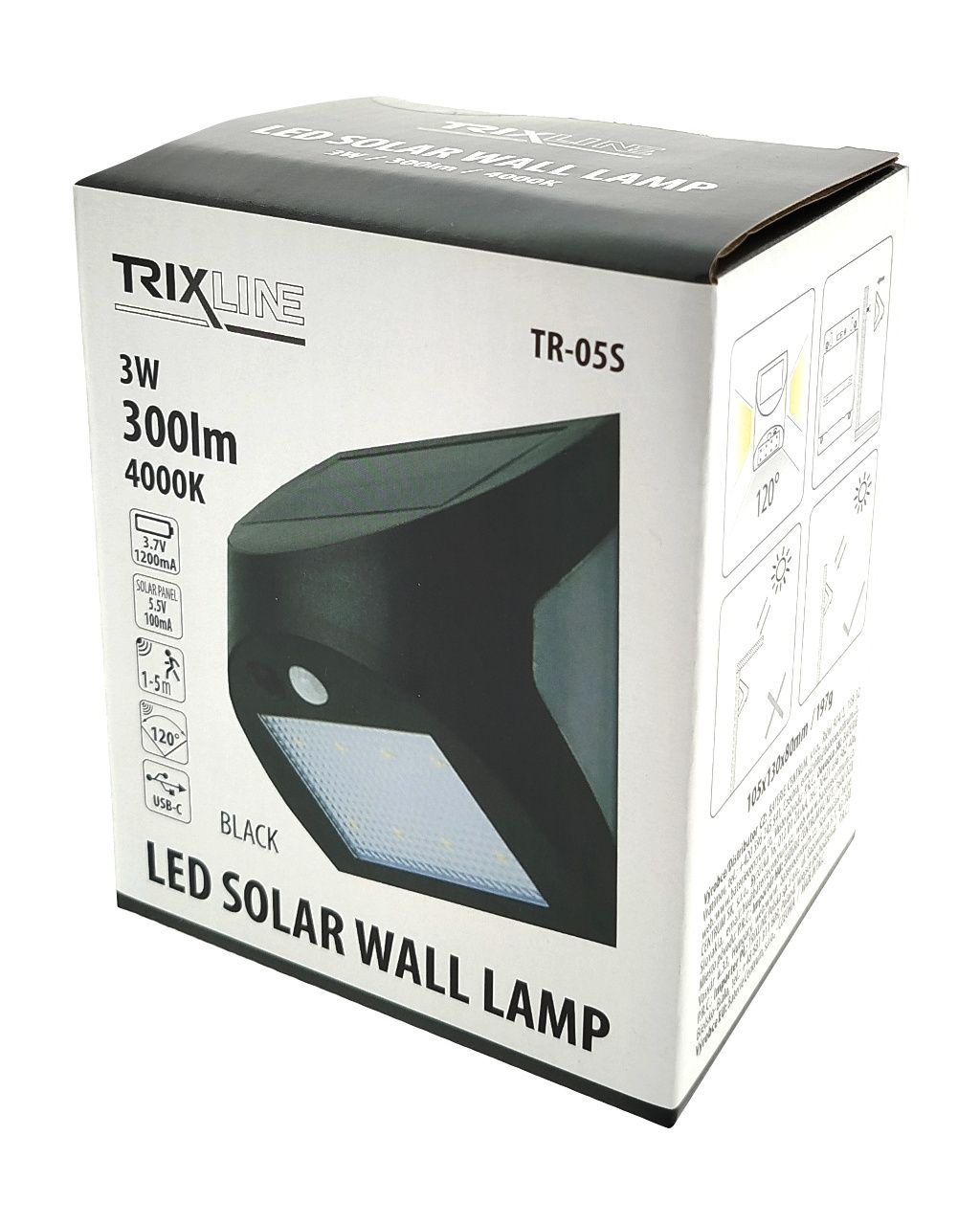 • LED solarna svjetiljka sa senzorom pokreta TR-05S  može se jednostavno postaviti na zid, na primjer, ima 8 LED svjetala sprijeda i 2 LED svjetla koja svijetle sa strane.
