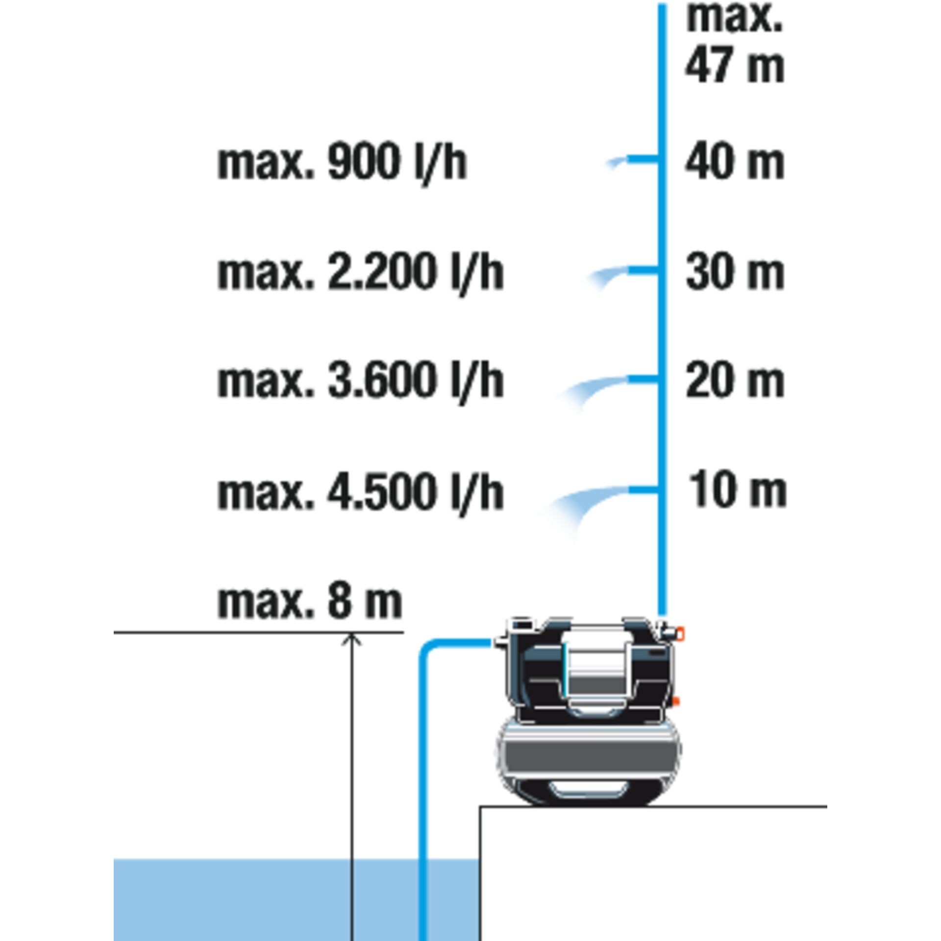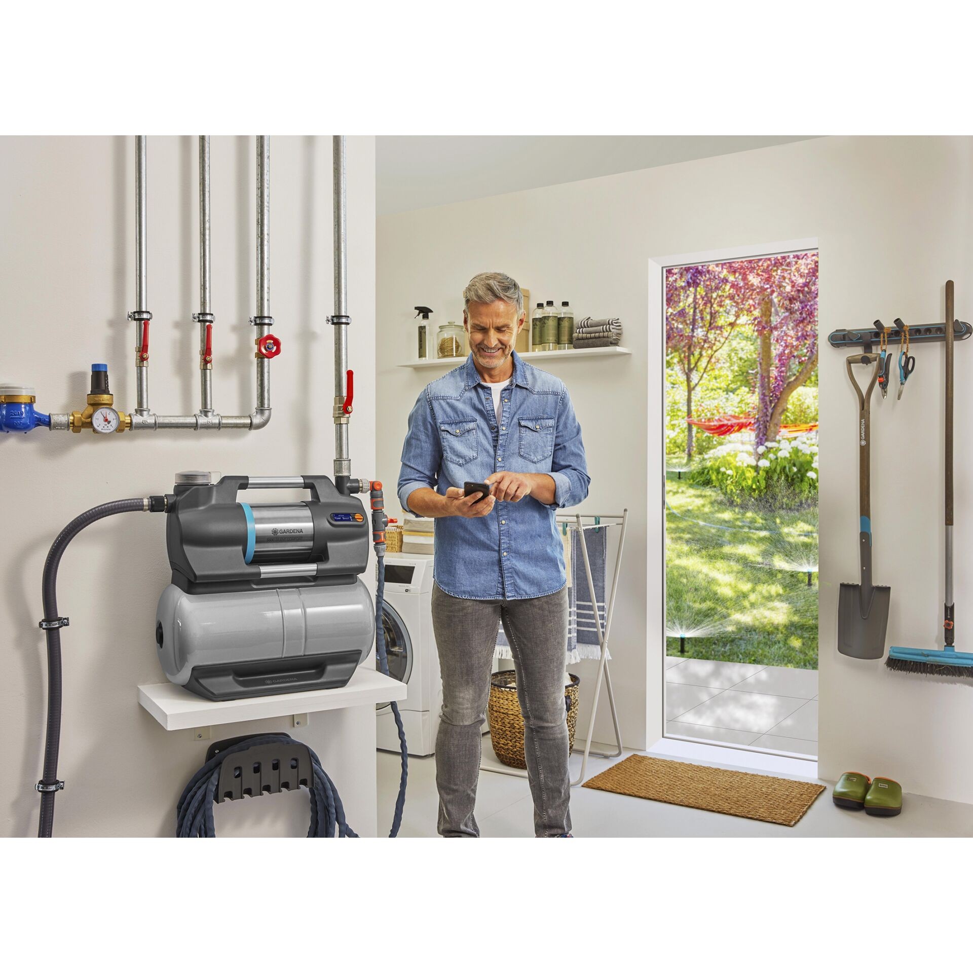 Otkrijte posebno tihe pumpe s Bluetooth kontrolom navodnjavanja i još većim performansama. S kućnim vodovodom 5600 SilentComfort, GARDENA vam predstavlja idealno rješenje za automatiziranu opskrbu vodom u domu i vrtu. Tlačna pumpa izuzetno je snažna s visinom isporuke od 47 m (4,7 bara) i protokom od 5600 litara na sat. Visoka učinkovitost kućnog vodovoda ogleda se u umjerenoj potrošnji energije od samo 900 W. Može crpiti vodu s dubine do 8 metara.