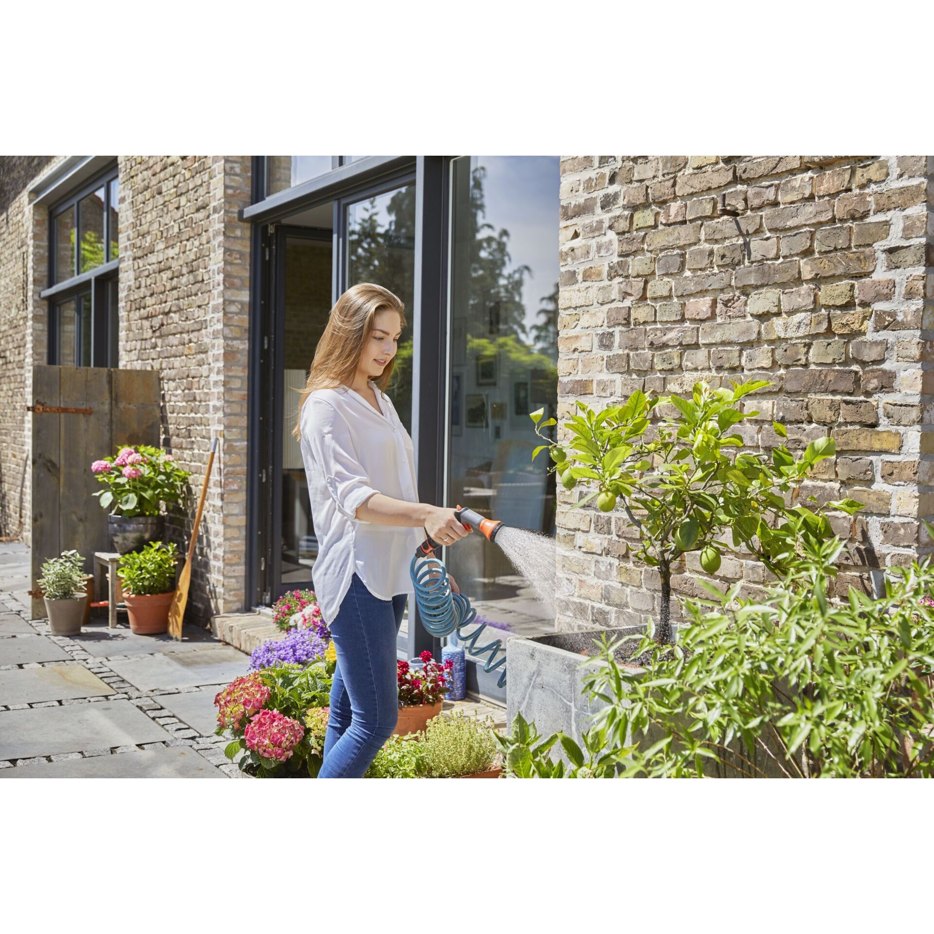 Spiral hose set is the convenient solution for watering plants on balconies, terraces or small gardens. The enclosed watering shower fits comfortably in the hand, the amount of water is infinitely adjustable and the pulse trigger can be fixed if desired.