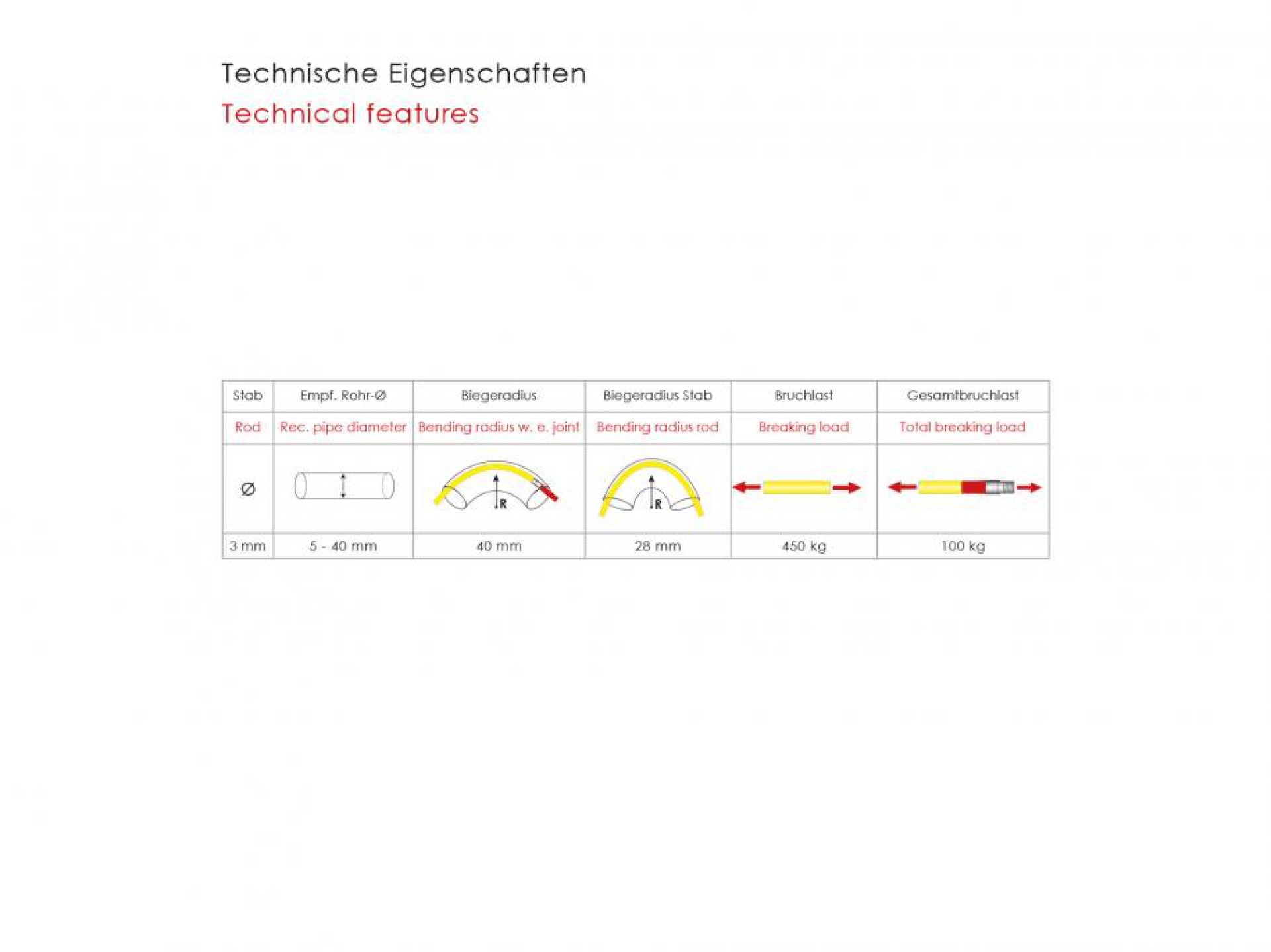• Kutija ima ergonomsku ručku za nošenje i protukliznu podlogu na stražnjoj strani. Ukupna čvrstoća na kidanje od 100 kg odnosi se na stakloplastičnu šipku Ø 3 mm s vođicom RG4.5 koja uključuje kompenzaciju zakreta.