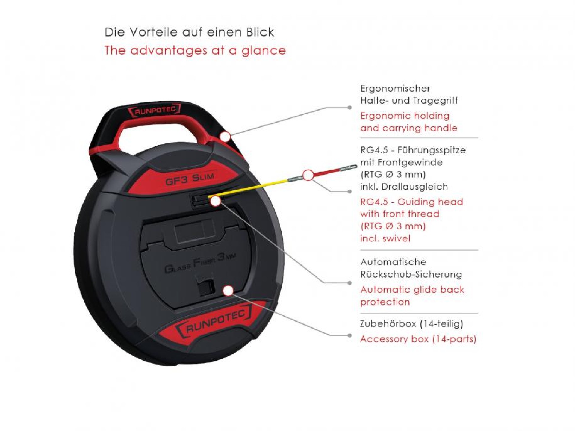 • Opseg isporuke: 1 x GF3 SLIM bez brojača metara u plastičnoj kutiji, duljina 20 m, 1 x RG4.5 - Vodilica s okretnim zglobom, sadržaj kutije s priborom: 1 x vučna ručka, 1 x specijalno ljepilo 3 g, 5 x završni spoj s navojem RTG Ø 3 mm, 2 x montažni ključ, 2 x vučna ušica Ø 4,5 mm, 1 x početna glava Ø 6 mm, 1 x početna glava Ø 4,5 mm, 1 x spojnica Ø 4,5 mm, 1 x adapter s navojem