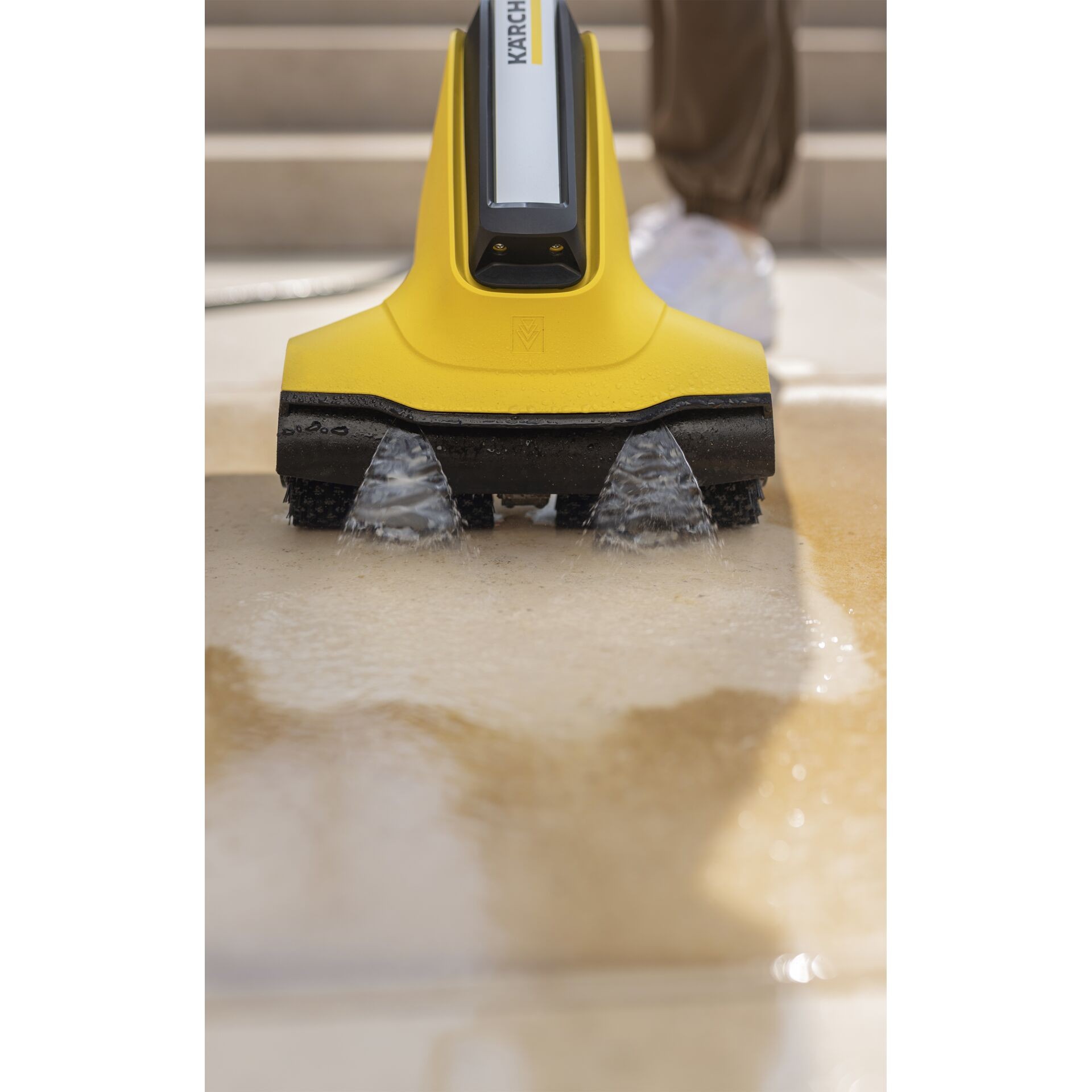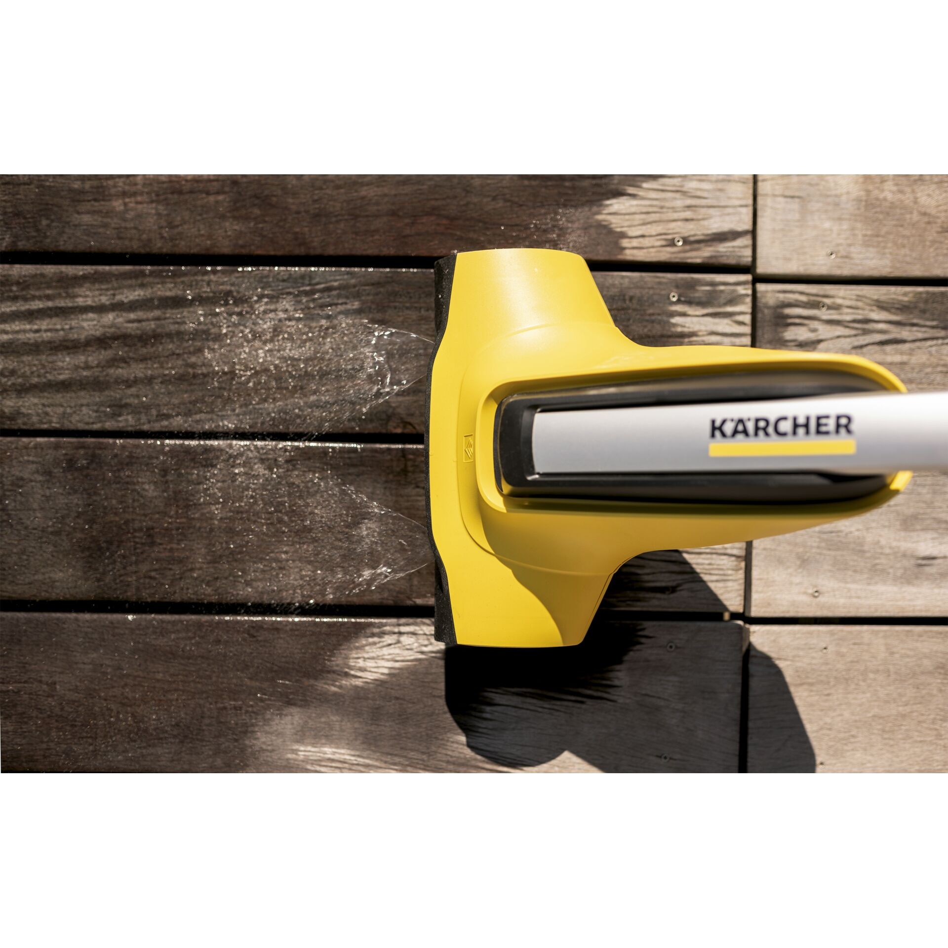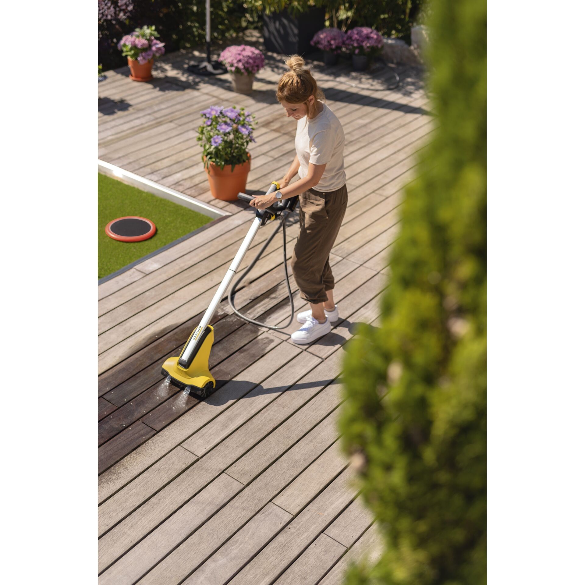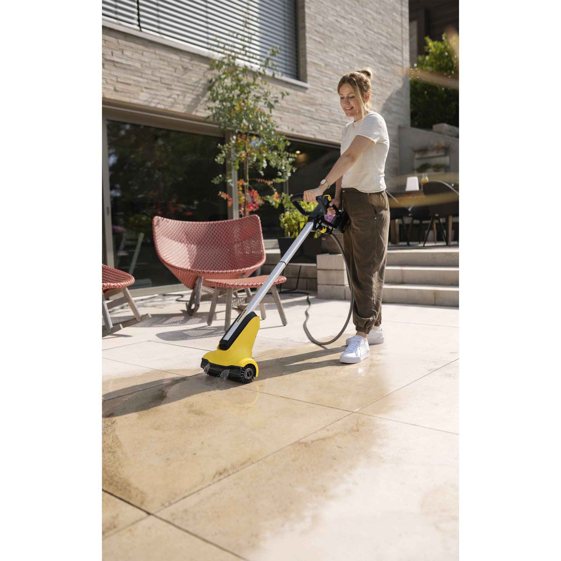 From now on, you don't need a nearby power socket or an extension cable to clean your patio or balcony thoroughly and gently. Because the PCL 3-18 patio cleaner cleans up to 20 square metres of wood, WPC or smooth stone tiles (brush rollers for stone optionally available) with one battery charge* . You can easily set how much water it uses. This is a convenient and resource-saving way to transform your outdoor area from a dirty corner into a radiant beauty. (* In combination with the 18 V/2.5 Ah Kärcher Battery Power exchangeable battery on wood)