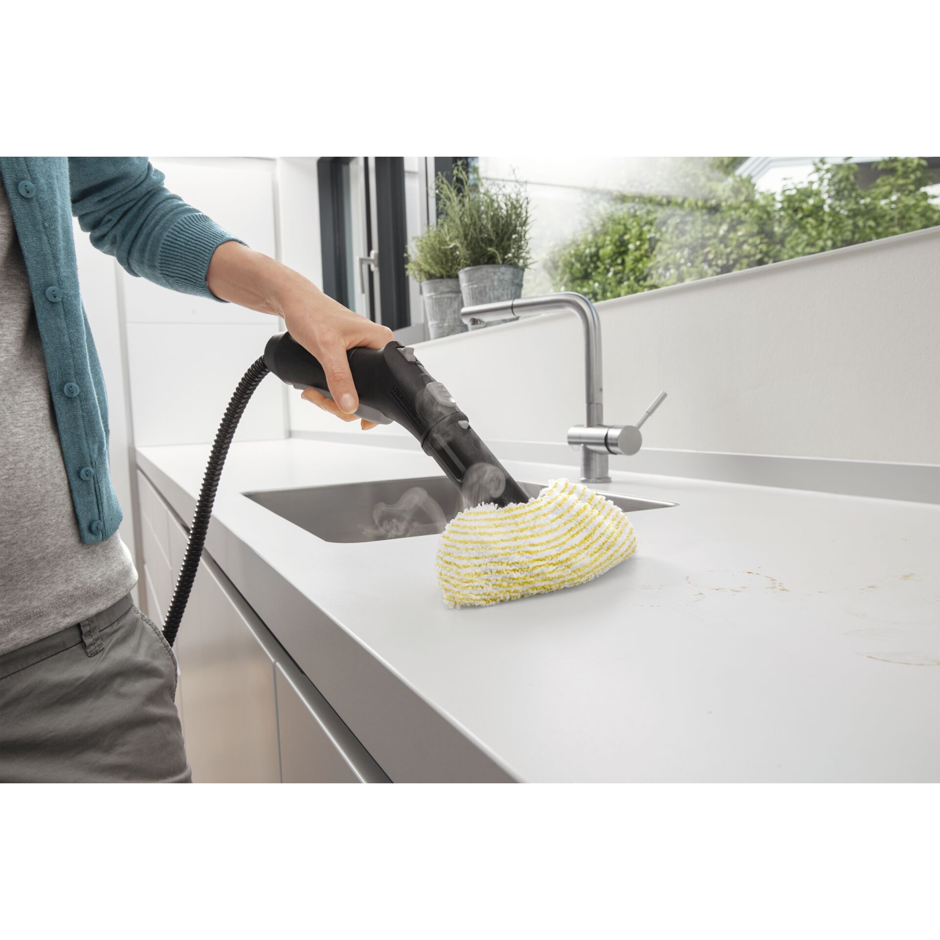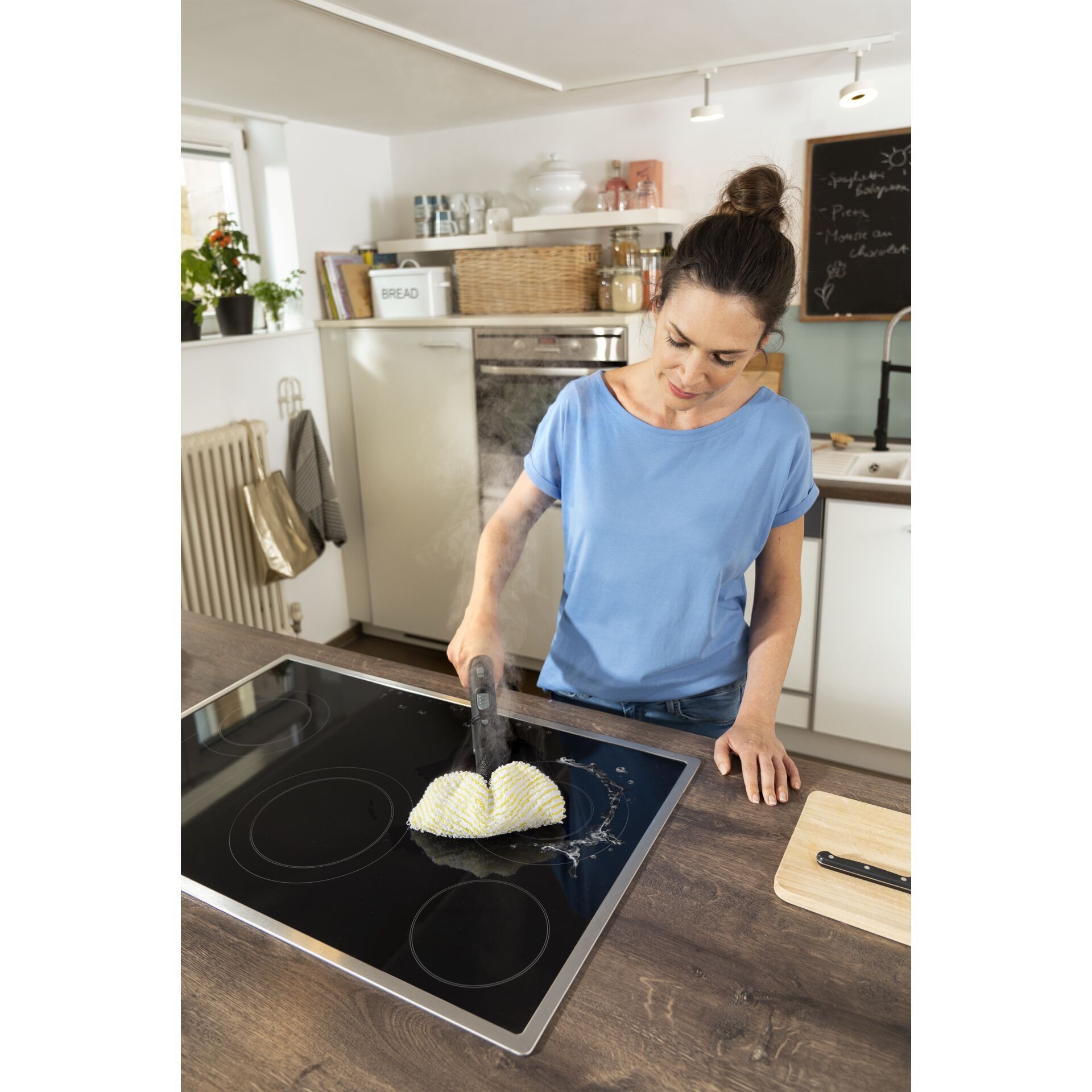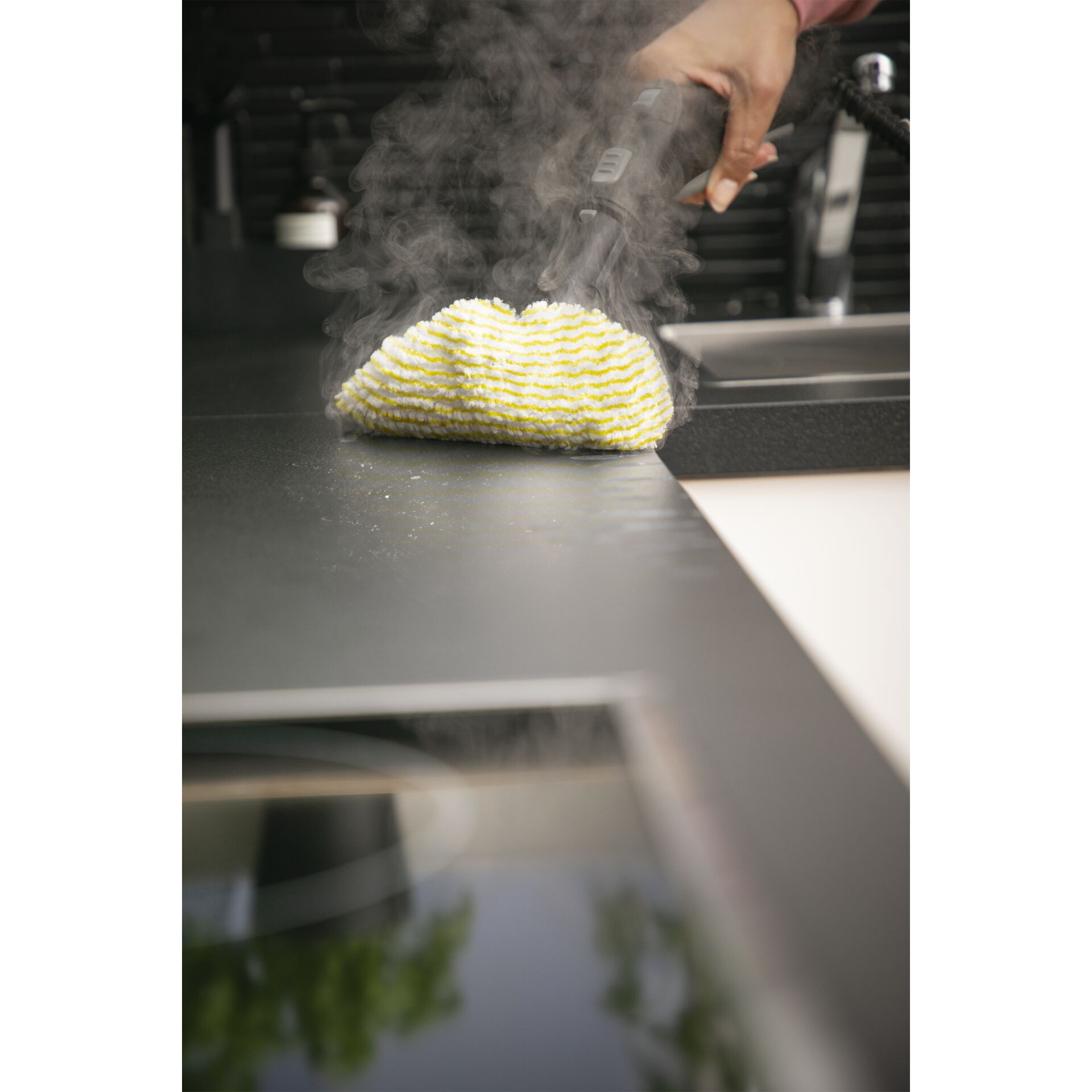 The two premium microfiber covers included in the set make the hand nozzle even more effective at loosening and picking up dirt and grease. Ideal for particularly heavy and stubborn dirt in the bathroom and kitchen. Even heavy soiling on the hob can be removed effortlessly. Thanks to the integrated elastic cord, attaching to and removing from the hand nozzle is child's play. The cord also ensures that the cover is held securely on the hand nozzle during cleaning.