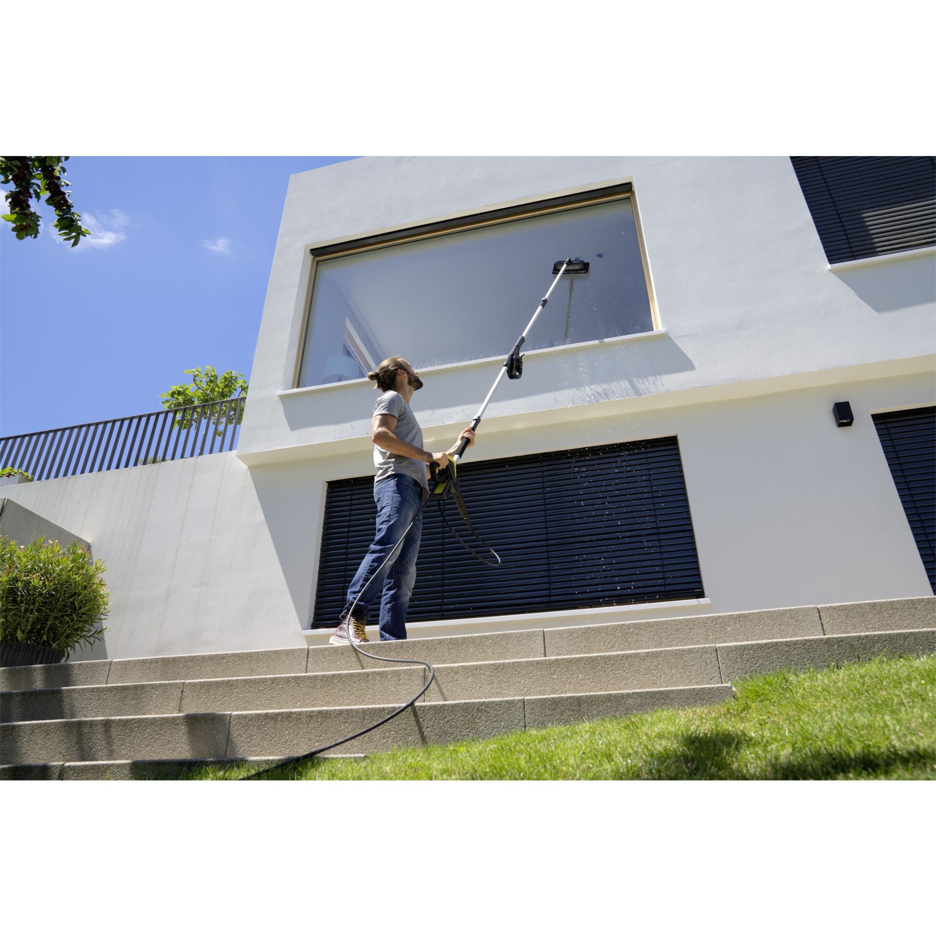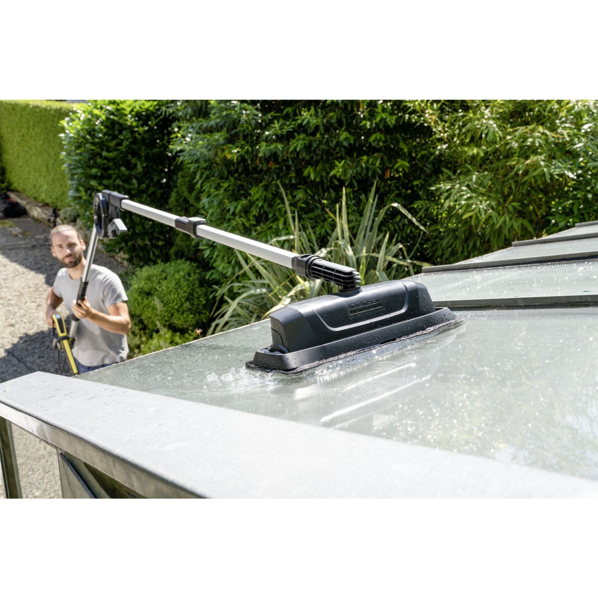 With the facade and glass cleaning attachment, facades and glass surfaces are optimally cleaned with high pressure. Particularly efficient in combination with the Kärcher telescopic spray wand.
