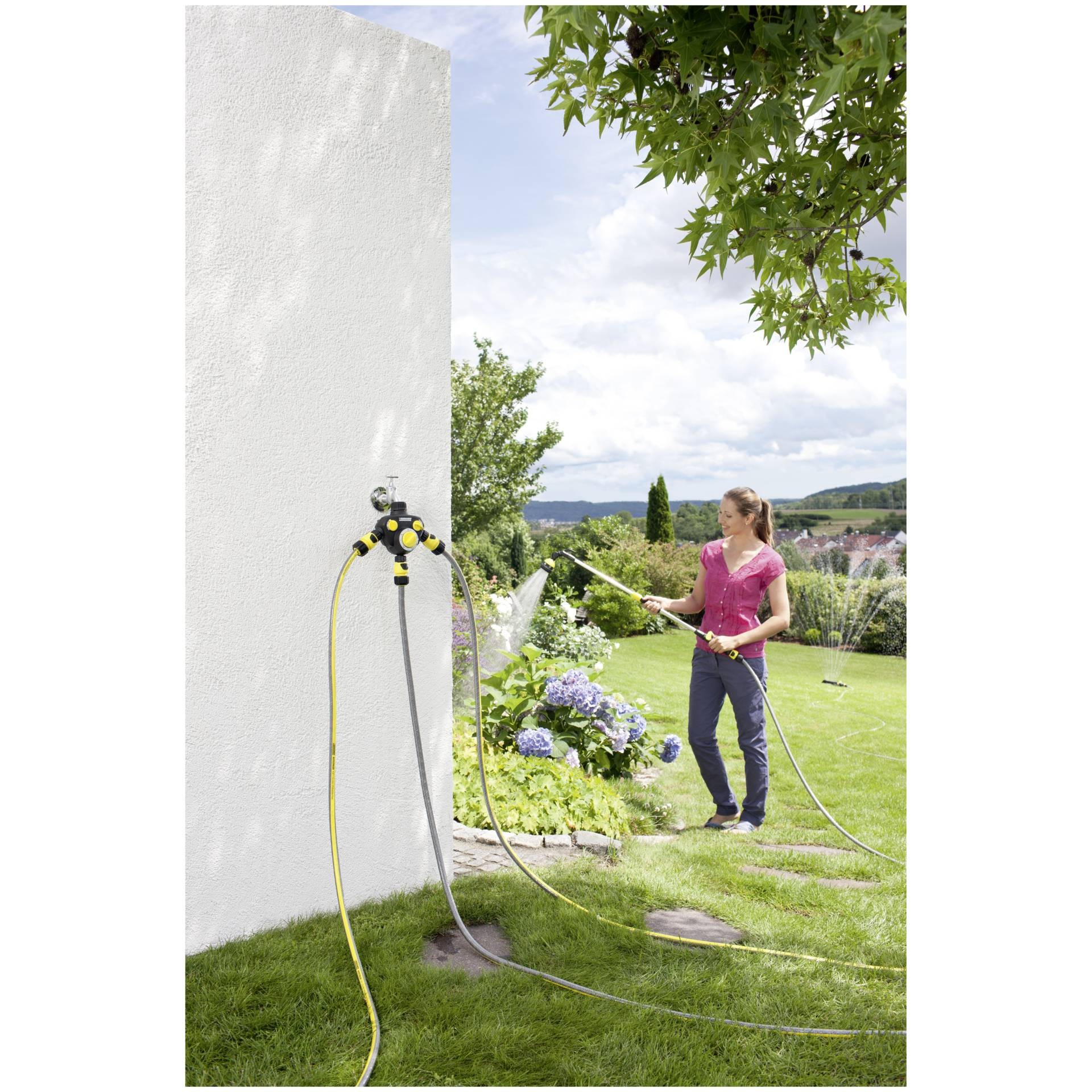 • 3-way distributor incl. watering unit. Watering stops automatically after the selected time has elapsed (max. 120 minutes). With G1 tap connection and G3/4 reducer.