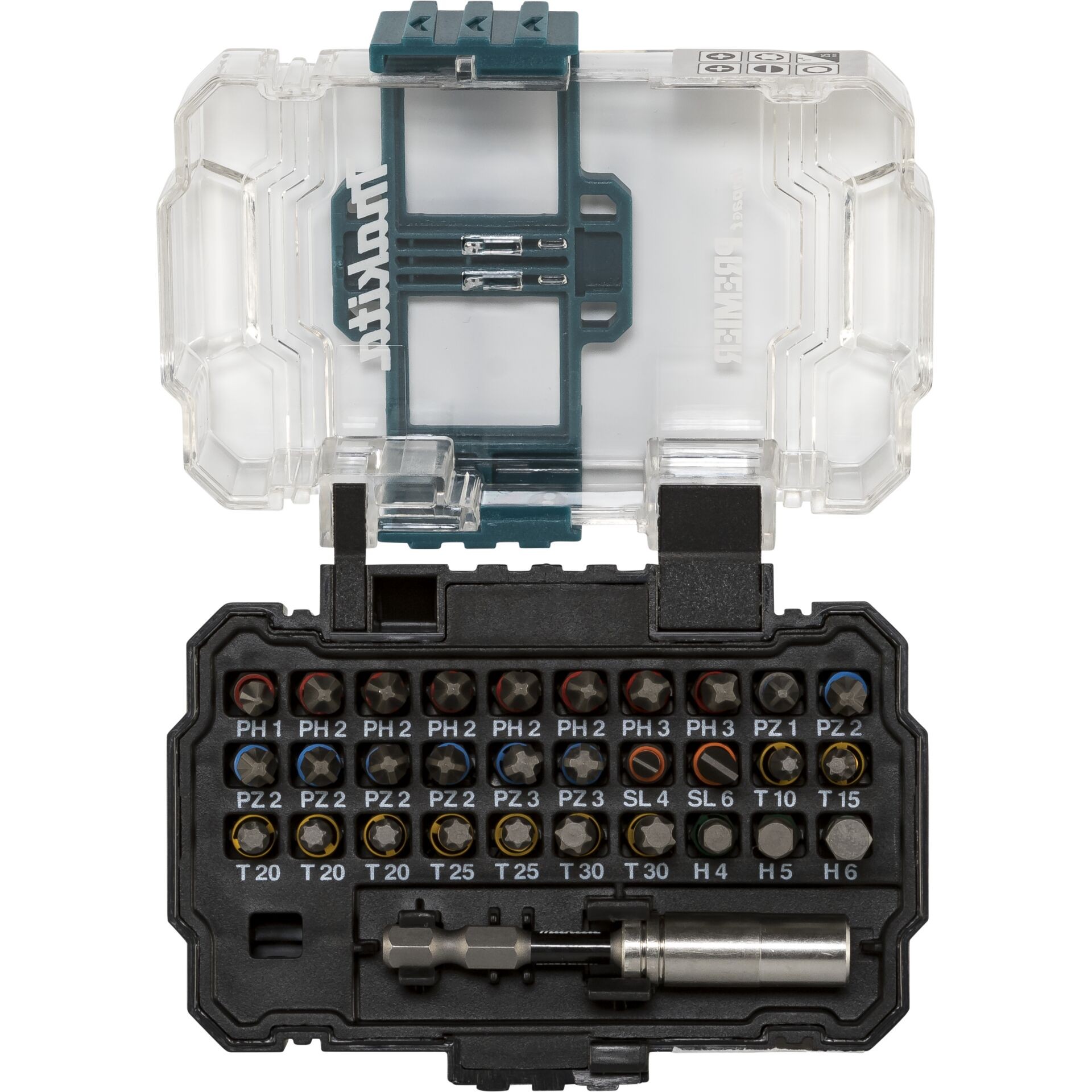 The Makita Torsion Bit Set E-13552 from the Impact Premier series is a 31-piece set designed specifically for the toughest conditions. The 25 mm torsion bits feature an enlarged torsion zone that optimally cushions impacts, and the color-coded tips make it easy to recognize the bit shape. The set is delivered in a robust bit box.