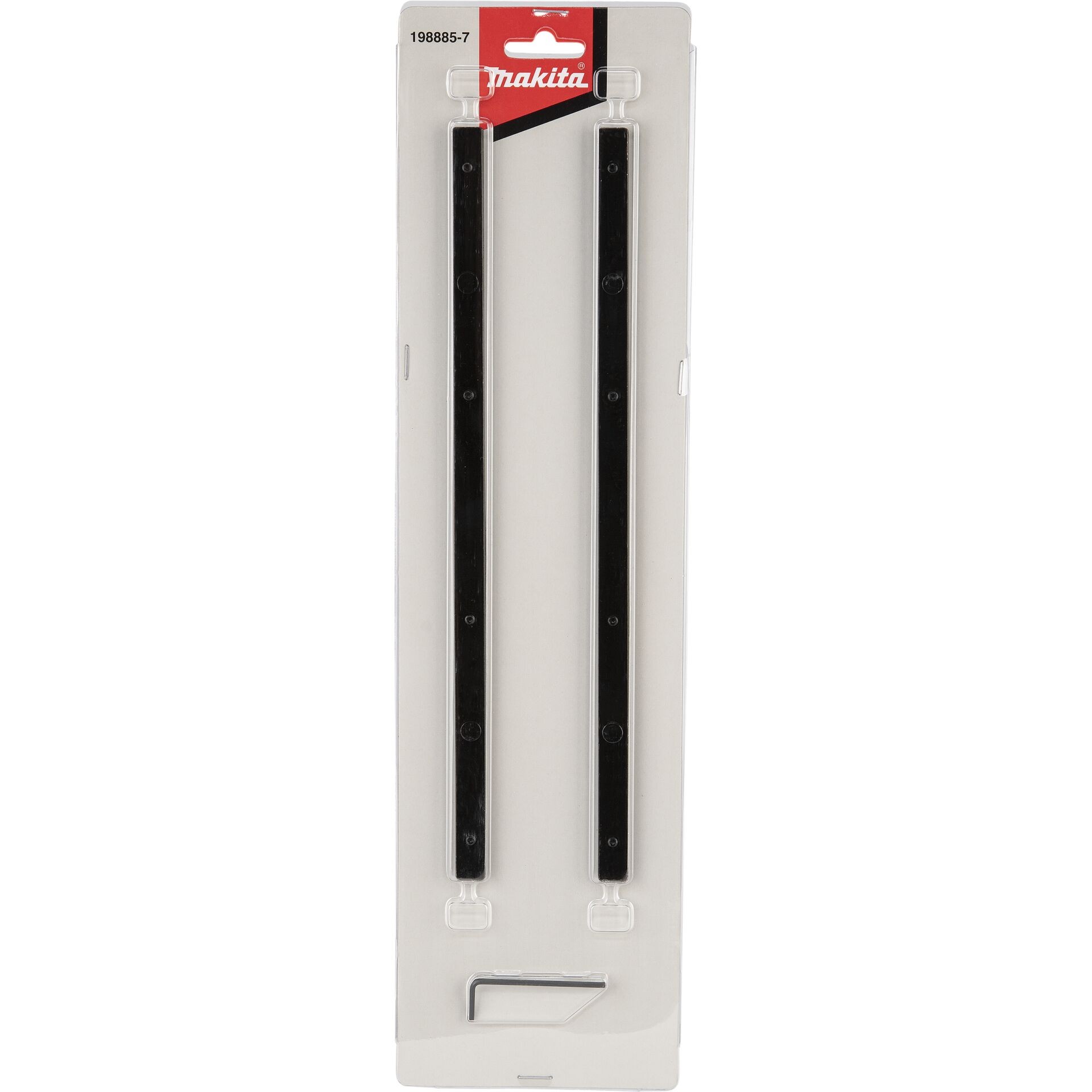 Two connecting rails for joining two guide rails together. Firmly held in place by screws tightened with a hexagonal pin spanner (included). Disappears completely into the guide rail, allowing the machine to slide over it without obstruction.