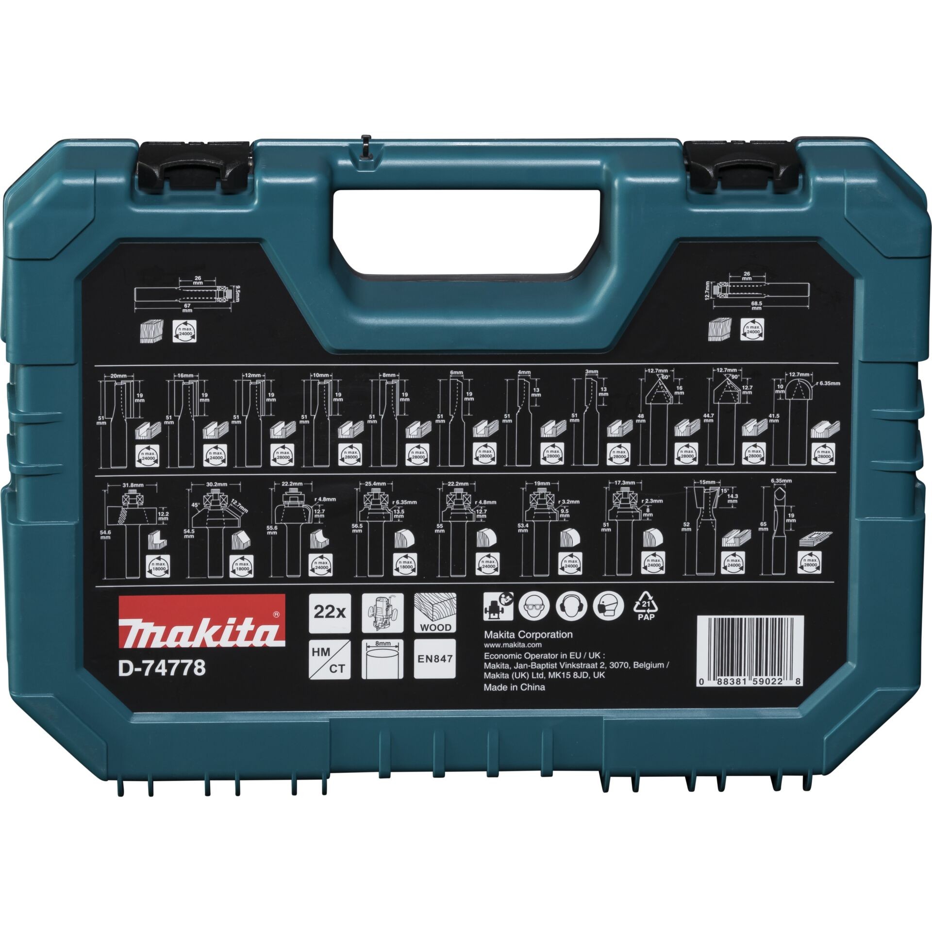 The Makita cutter set D-74778 is a 22-piece set designed specifically for precise woodworking. It contains a variety of cutters with a shank diameter of 8 mm and comes in a sturdy transport case with transparent lid. This set is ideal for carpenters, do-it-yourselfers and furniture factories who value quality and versatility.