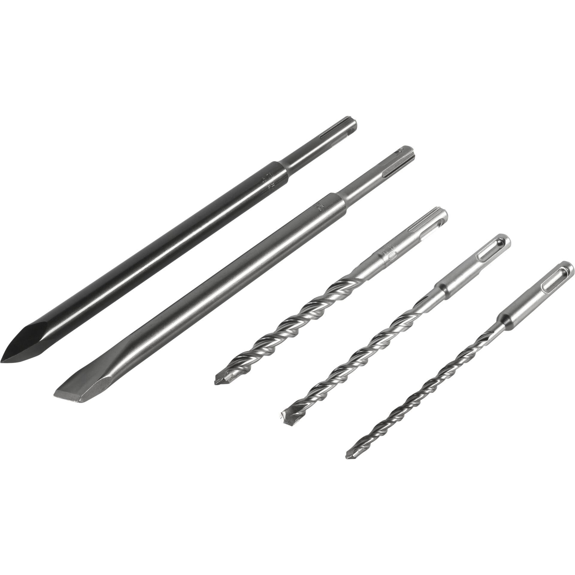 • Contents: 1 hammer drill bit Ø 6x 160 mm, 8x 160 mm, 10x 160 mm, 1 pointed chisel 250 mm and 1 flat chisel 250 x 20 mm