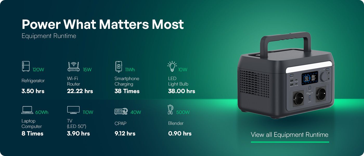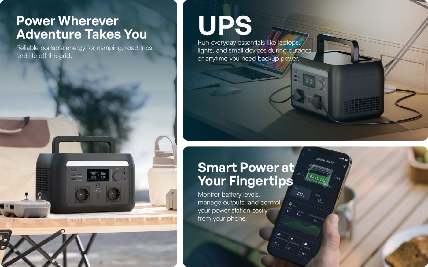 • Prijenosna elektrana od 600 W s LiFePO4 baterijom od 512 Wh, ugrađenom UPS funkcijom (bypass način rada), AC i solarnim punjenjem do 200 W, neproširivom i pametnim upravljanjem putem aplikacije s Wi-Fi povezivošću. Čisti sinusni inverterski sustav, više AC/DC/USB izlaza za stabilno napajanje uređaja i malih kućanskih aparata.