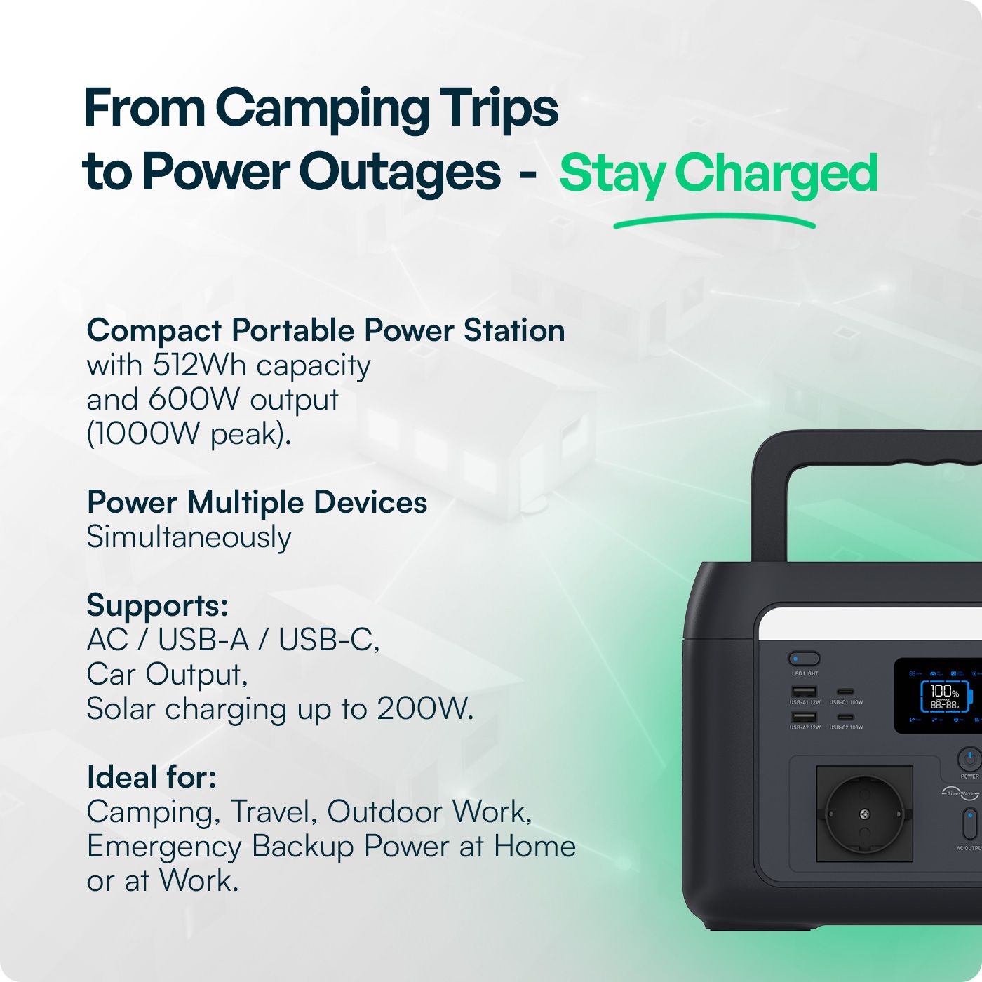 Prijenosna power stanica 600W / 512Wh LiFePO4 – WiFi, solarno punjenje i UPS