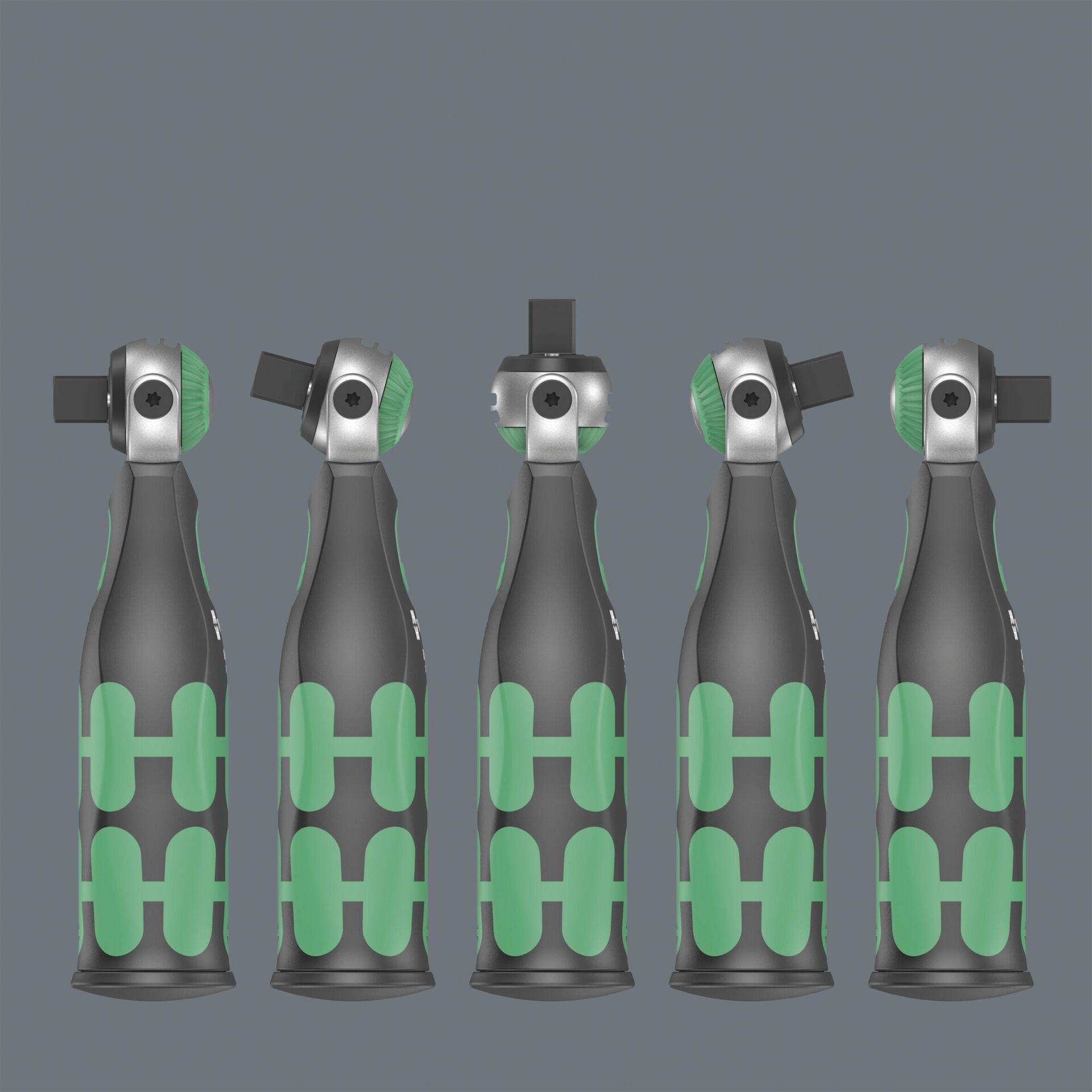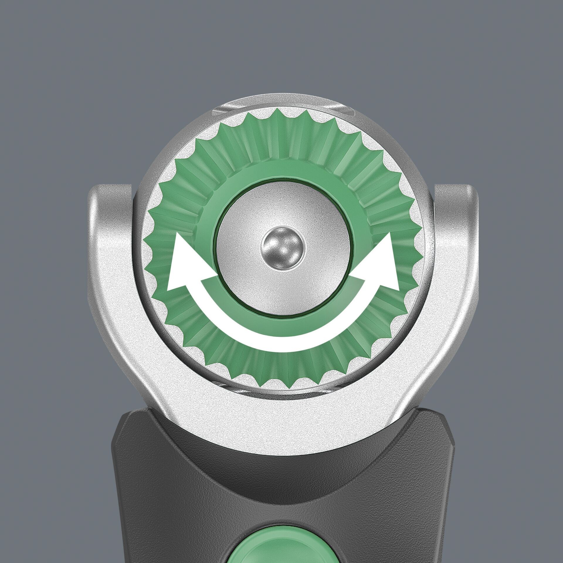 The ratchet head can be freely swivelled and locked in any fixed position by means of the slide switch on both sides. Problem-free working with large hand space is possible even in very narrow or hard-to-reach places.