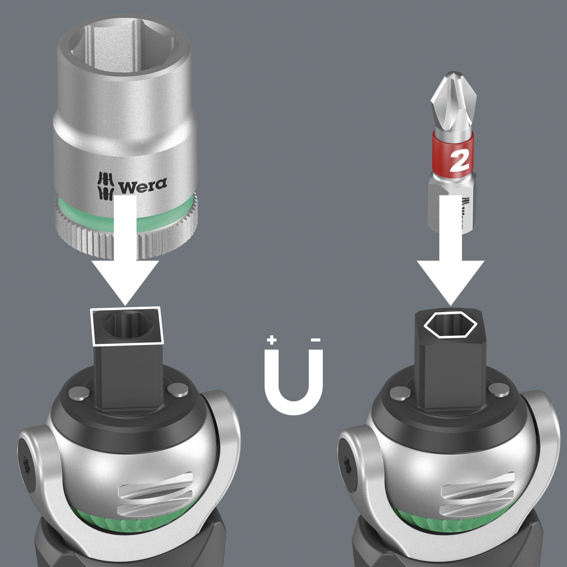 • The magnetic direct mount turns the 3/8" ratchet into a bit ratchet screwdriver with 1/4" bit mount at the same time