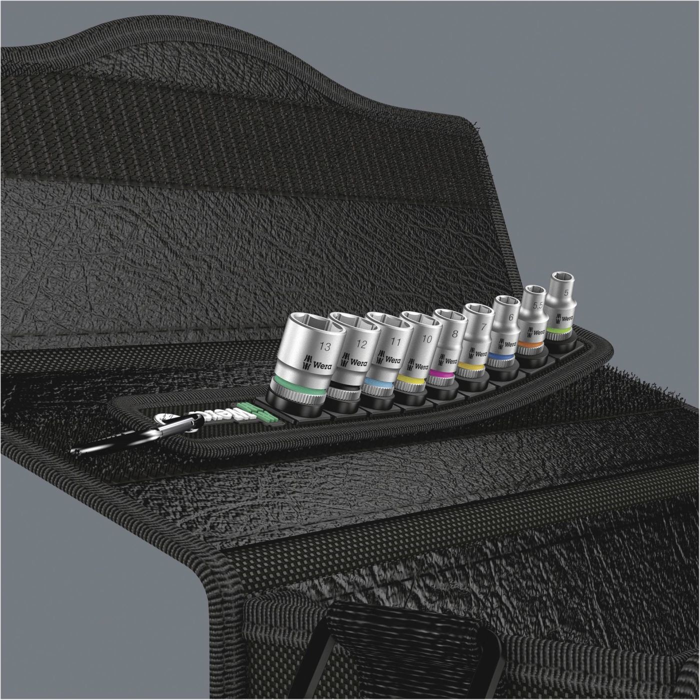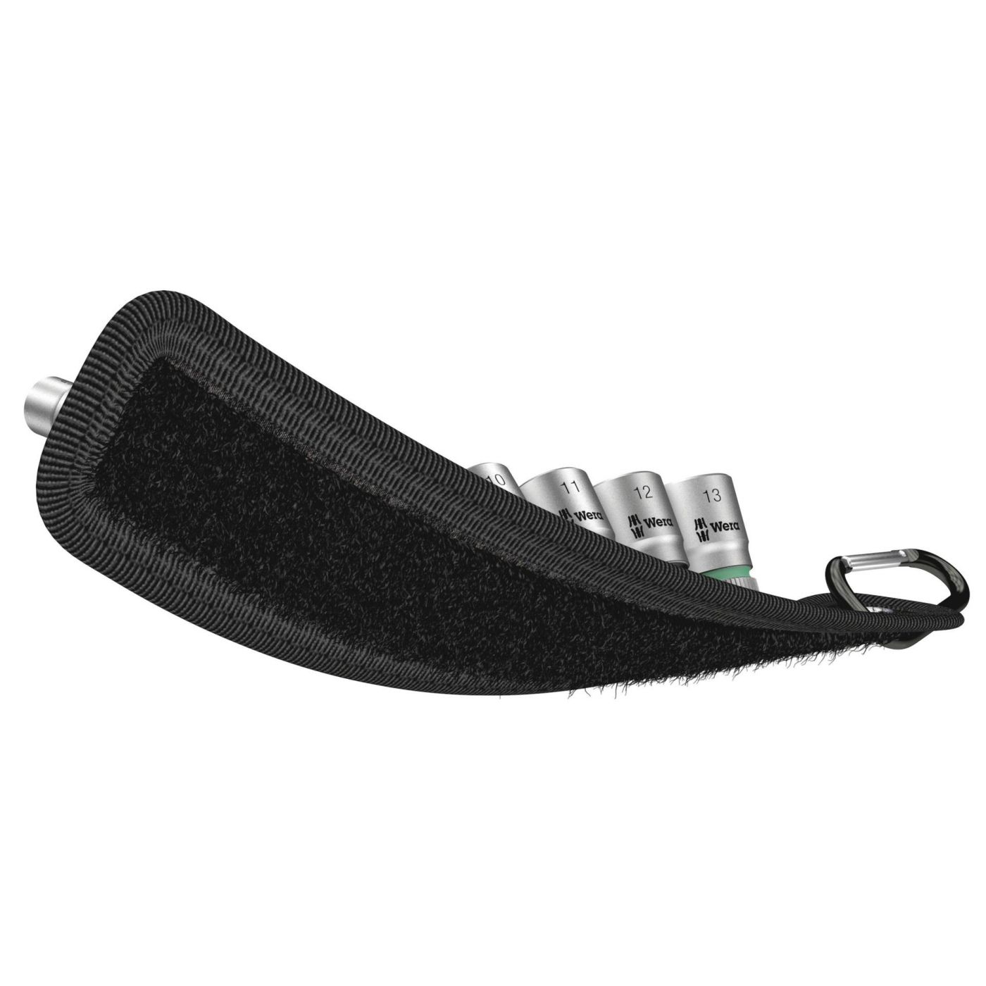 Tipično Wera dizajniran robusni tekstilni remen s 9 nasadnih ključeva zauzima minimalan prostor, Mehanizam Twist to Unlock s glatkim okretanjem osigurava sigurno prianjanje i jednostavno uklanjanje nasadnih ključeva, Dolazi s tražilicom alata „Take it easy“ s kodiranjem boja prema veličini kako bi se omogućio jednostavan i brz odabir pravog alata, Uključuje kuku za sigurno pričvršćivanje na omču remena ili džep, Isporučuje se s netkanom poleđinom bočne i čičak trake za jednostavno pričvršćivanje npr. na zid, policu, kolica za alat i na sustav za transport alata Wera 2go,