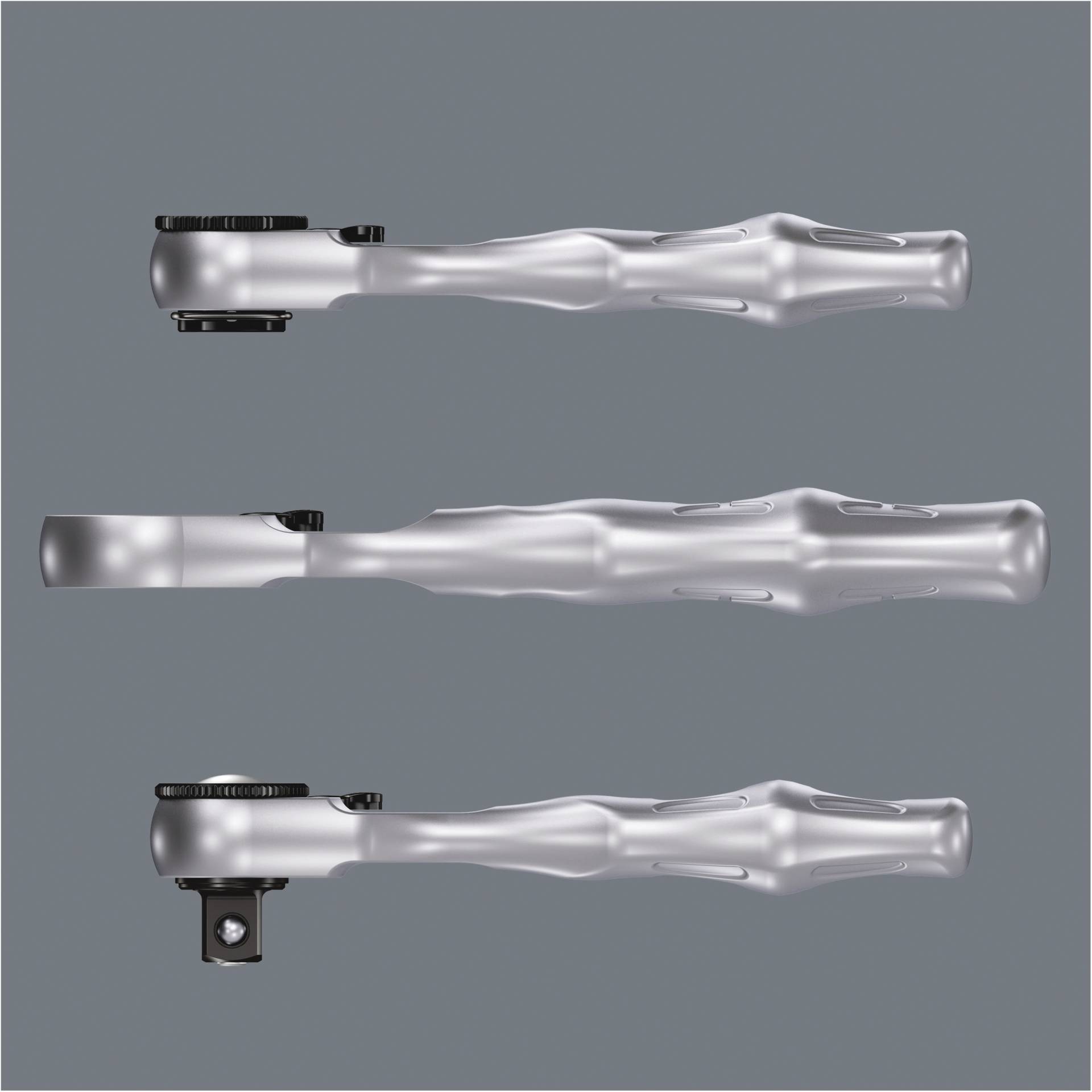 Ratchets and screws in a Kraftform Kompakt format. These drop-forged, full-steel ratchets, Zyklop Mini 1 and 2, combine filigree design with incredible robustness. For particularly rapid screwdriving in confined working situations. Zyklop Mini 1 or Zyklop Mini 2 can be used whenever screwdriving with power tools or conventional hand tools is unfeasible for lack of space. 1 bit ratchet Zyklop Mini 1; suitable for the take-up of bits with 1/4" hexagon head drive as per DIN ISO 1173-C 6.3 and E 6.3 and Wera connecting series 1 and 4; also possible to use 1/4" sockets by attaching the Wera adaptor 870/1. 1 socket ratchet Zyklop Mini 2; suitable for the direct attachment of Wera Zyklop special sockets 8790 FA.