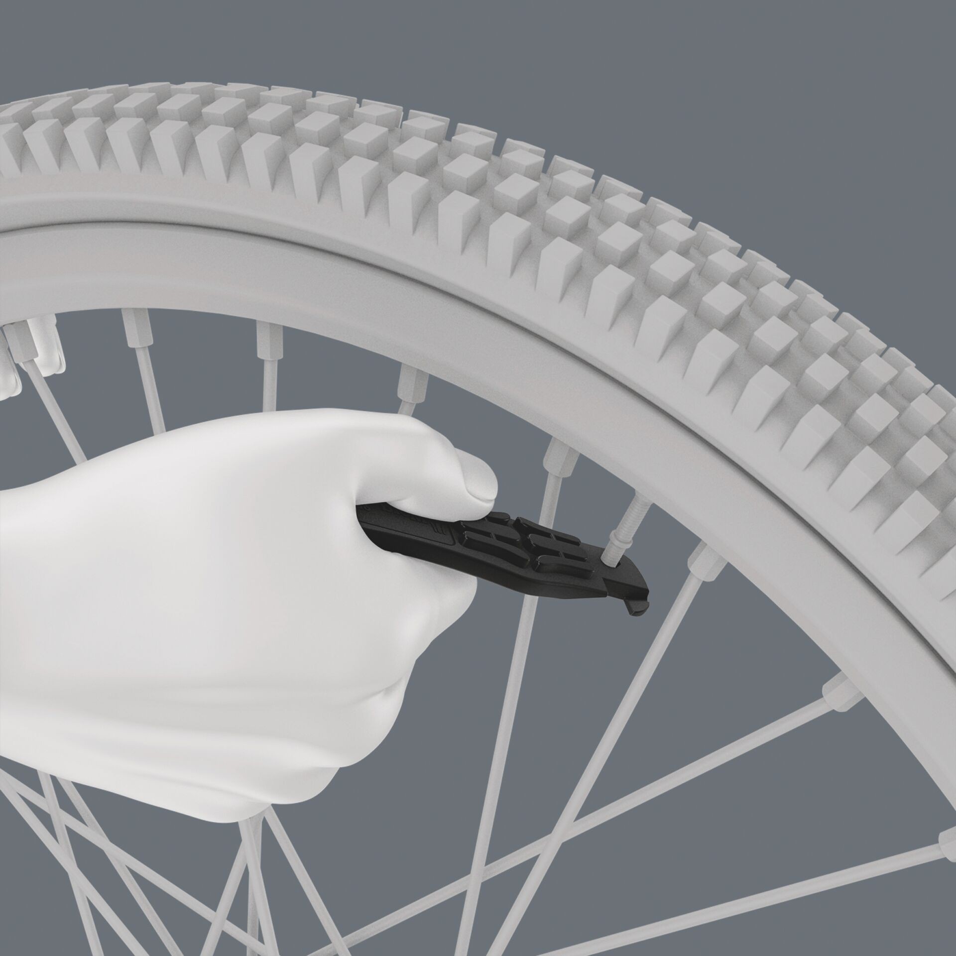 With the fiberglass-reinforced plastic tire levers, tires can be safely levered off the rim without damaging the rim. Use one tire lever to lift the tire off the rim, hook it into a spoke, and use the second tire lever to pull the tire off. The two tire levers can be clicked into each other and are thus not lost individually.