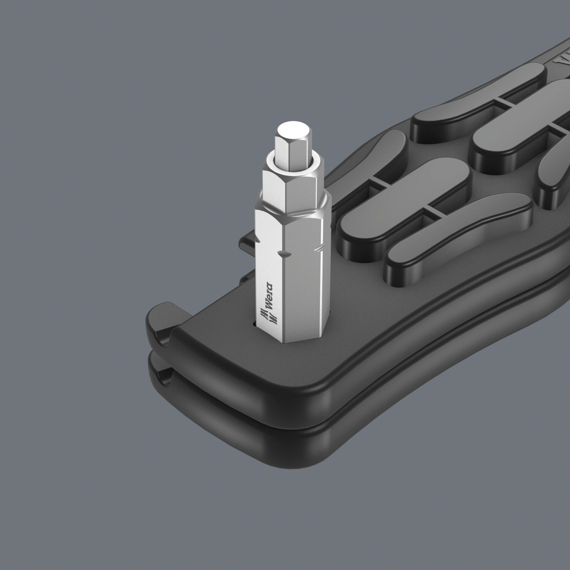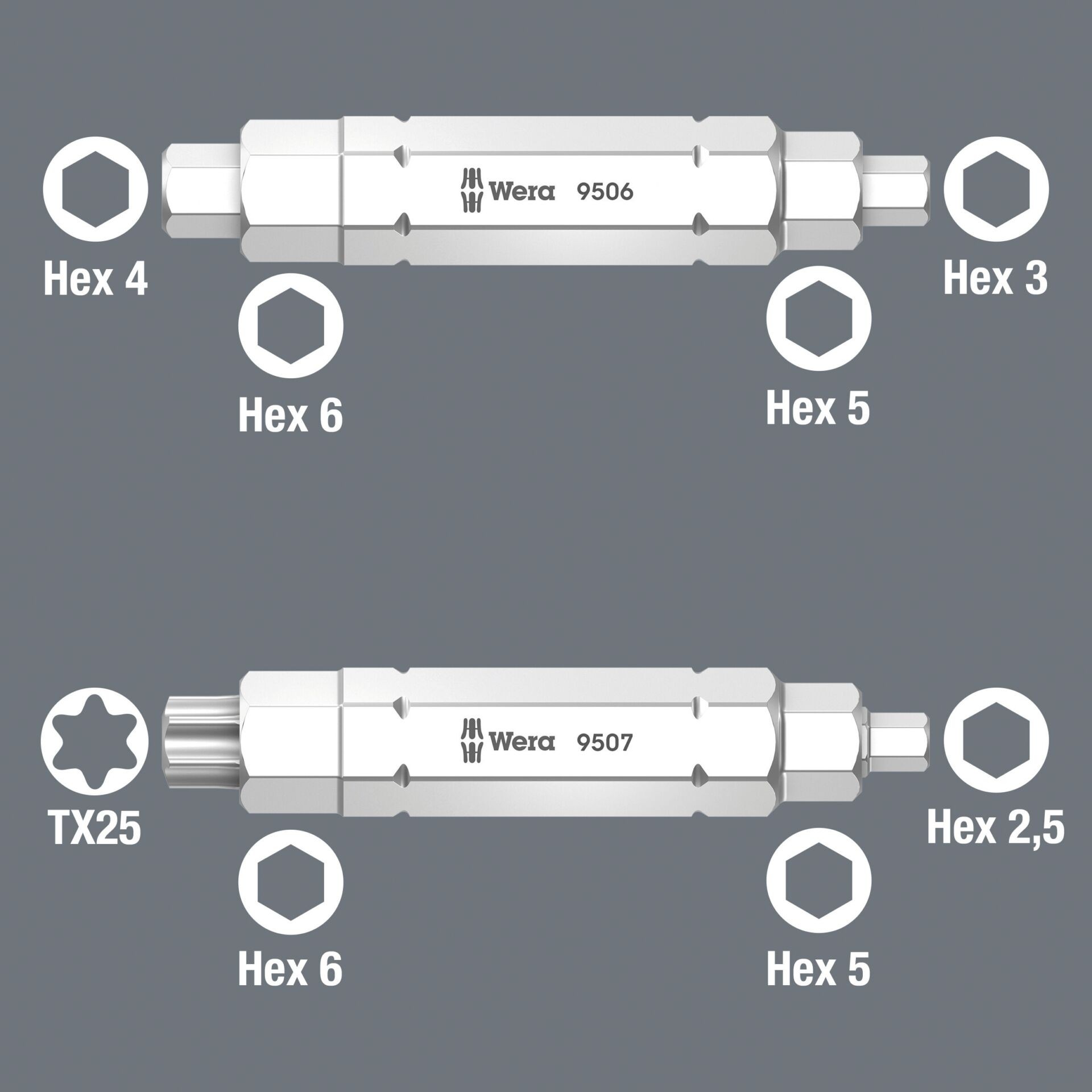 The 4-in-1 Bits 9506 and 9507 can each be used to operate four screw sizes. With the 4-in-1 bit 9506, four sizes of hexagon socket screws (3.0; 4.0; 5.0; 6.0), and with the 4-in-1 bit 9507, three sizes of hexagon socket screws (2.5; 5.0; 6.0) and one size of TORX® screws (TX 25). To use the larger profile in each case, press continuously against the spring force while screwing so that the smaller profile is countersunk and the larger profile can be inserted.